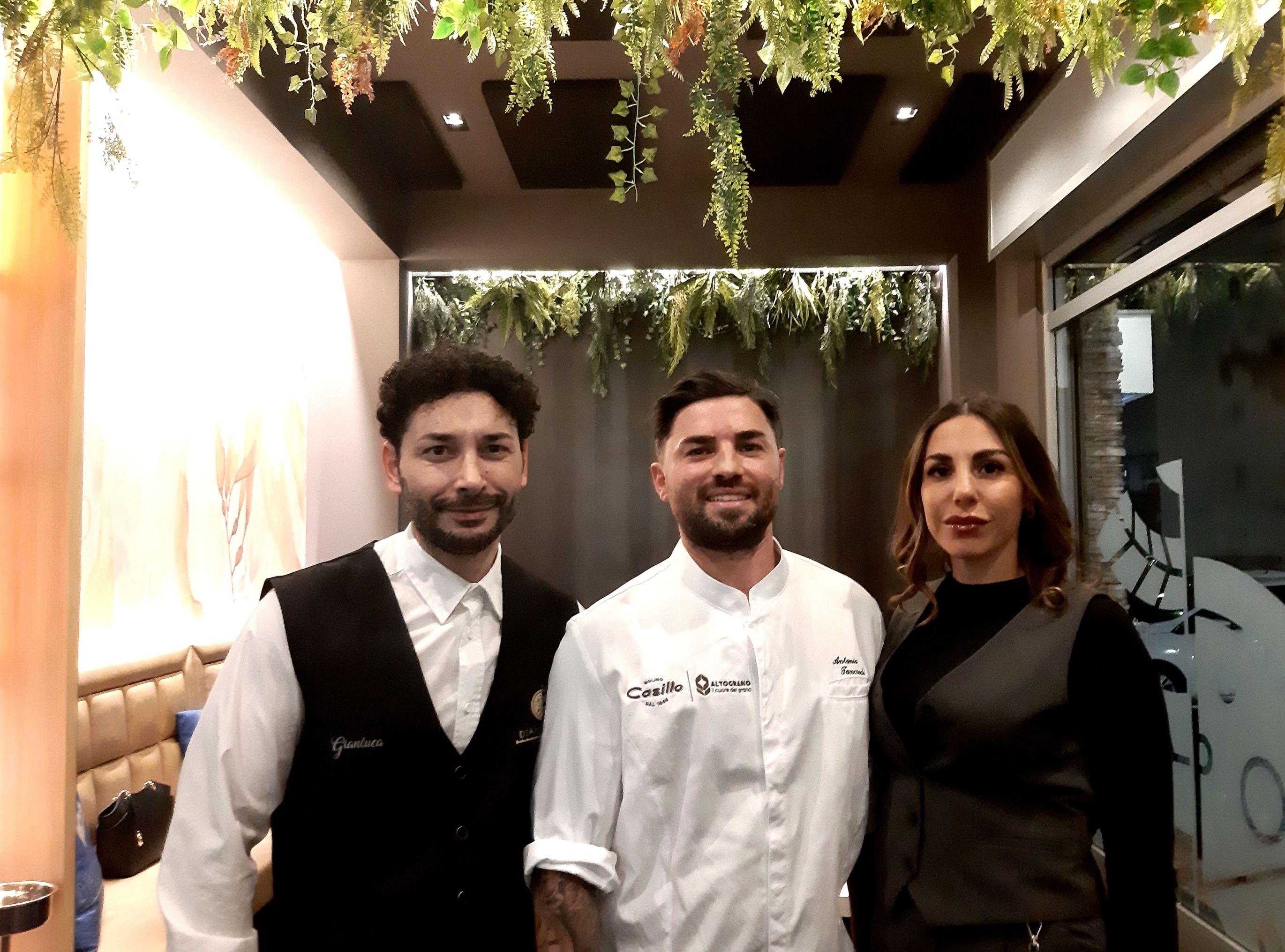 Bello il dehor esterno con tanto di palma decorata al centro, ancor più eleganti gli arredi interni per un totale di quasi 120 coperti a disposizione. La moglie Martina gestisce le esigenze di sala dei clienti coadiuvata da Gianluca Orabona, prossimo sommelier che già cura una buona selezione vini.