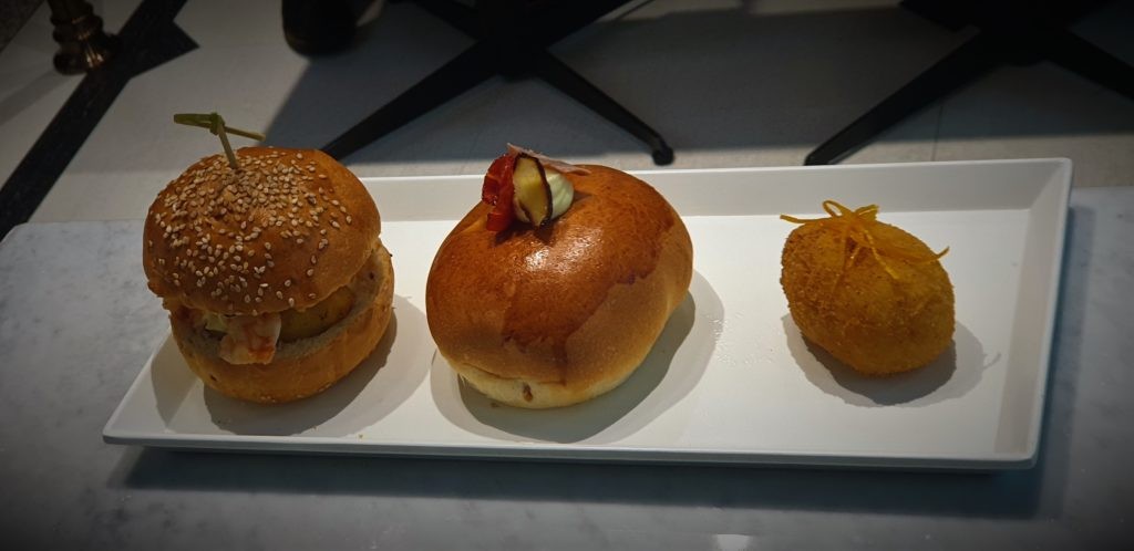 Lo Chef ci ha proposto tre piatti della tradizione rivisitati da poter degustare in piedi o camminando verso il punto di arrivo o, visto che ci troviamo in aereoporto, di partenza.