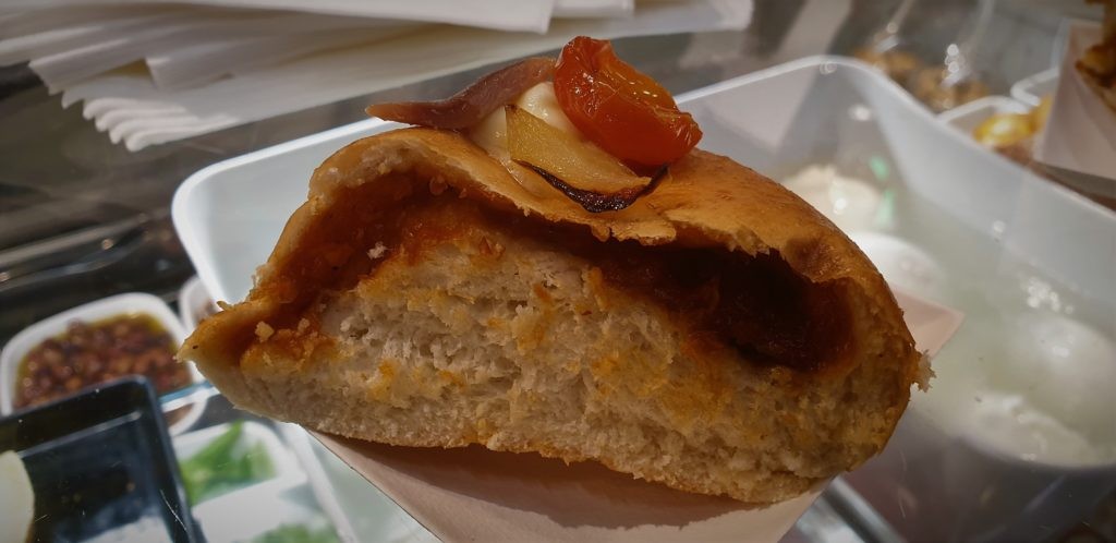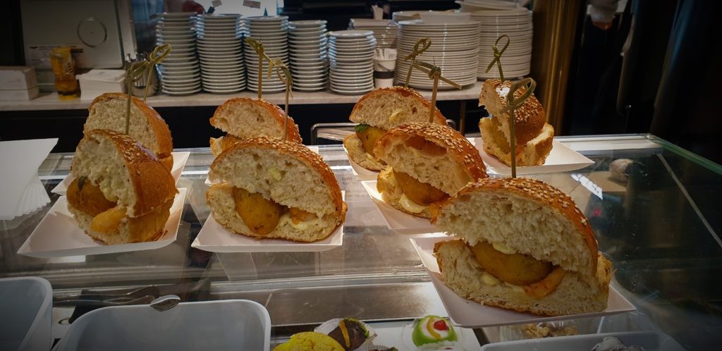 Continuiamo con Panelle e crocchè, una Panella (focaccia fatta con farina di ceci) aromatizzata ai semi di finocchio, tipica della cucina palermitana, farcita con crocchè di patate aromatizzate alla menta e gamberi al limone, il tutto farcito con maionese fatta in casa. Mentre si morde la panella troviamo le diverse consistenze che scaturiscono dalla patata e dal gambero, questo ci spinge in automatico a mordere nuovamente e senza che uno se ne accorga questa delizia è finita. Una tentazione sublime. € 9,00