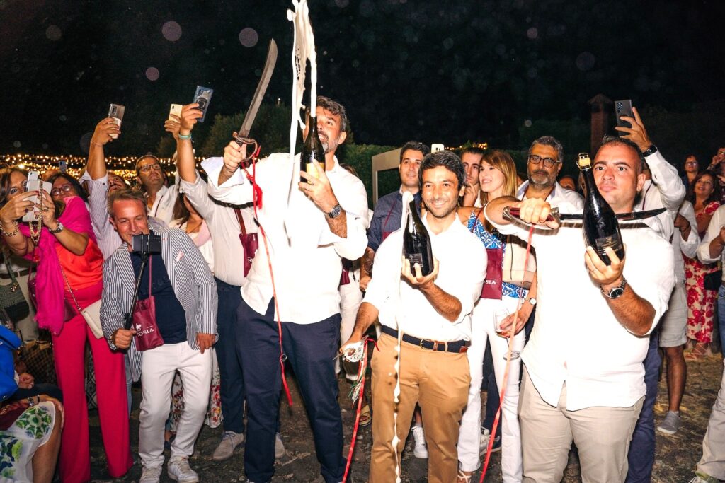 Alle 20.30, la tradizionale sciabolata di benvenuto darà il via ai festeggiamenti del “Sosta Tre Santi Party” che anche quest’anno propone un programma ricco di sorprese, musica, divertimento e di ospiti prestigiosi, che si alterneranno nel salotto tra le vigne curato della redazione di Living in The City, media partner di questa edizione. Non mancheranno le bollicine, con i banchi d’assaggio delle ultime sboccature delle etichette di Metodo Classico Blanc de Noir, Blanc de Blancs e Rosé Sosta tre Santi e dei vini Etna Doc Bianco e Rosso di contrada Monte Gorna e contrada Monte San Nicolò di Tenute Nicosia, dei prestigiosi spumanti Trento Doc Ferrari e delle cuvée della celebre maison di Champagne Palmer & Co.