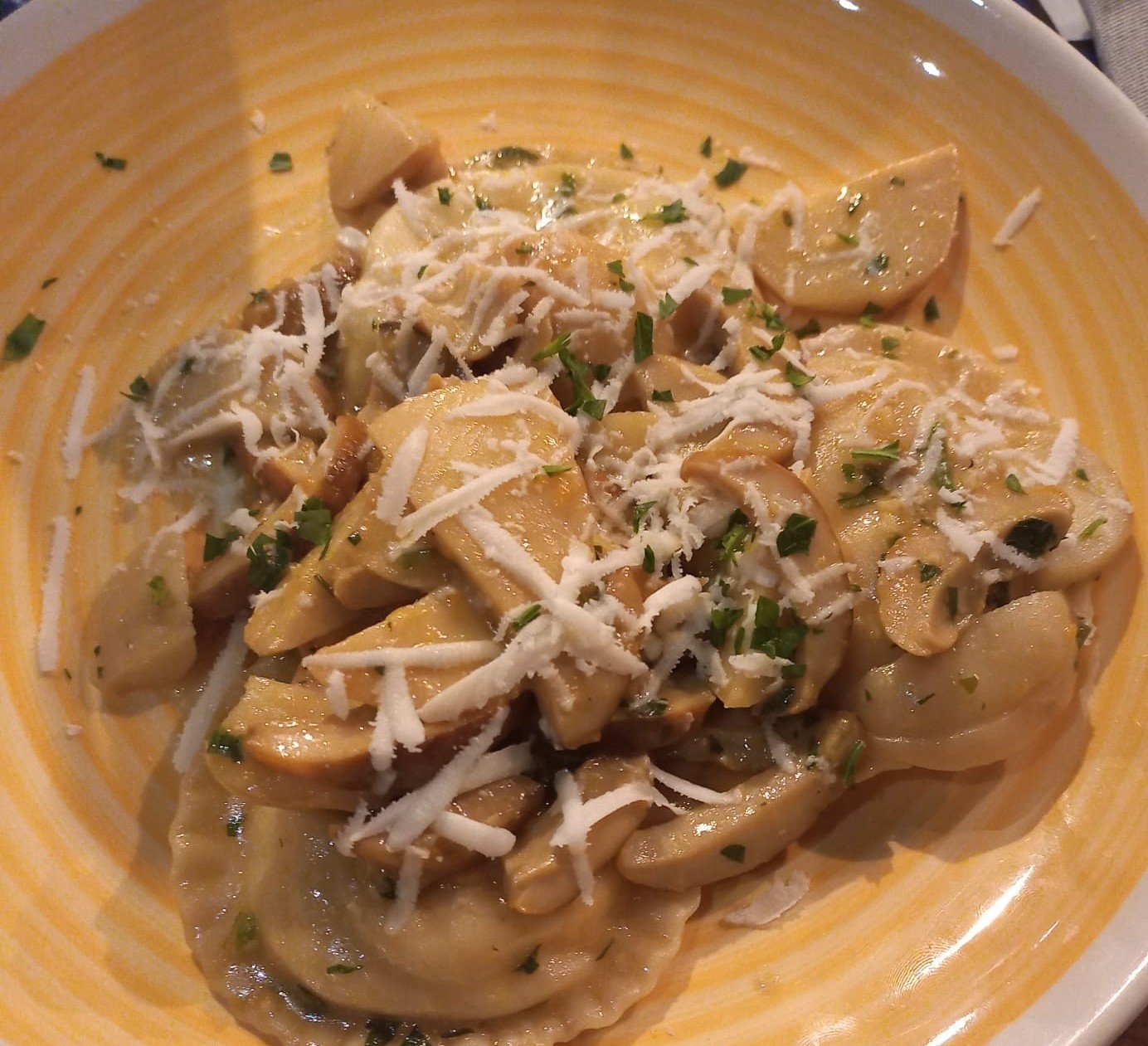 Ravioli ripieni di bufala e provola affumicata serviti con funghi porcini e paste varie condite con alici, baccalà e ricciola