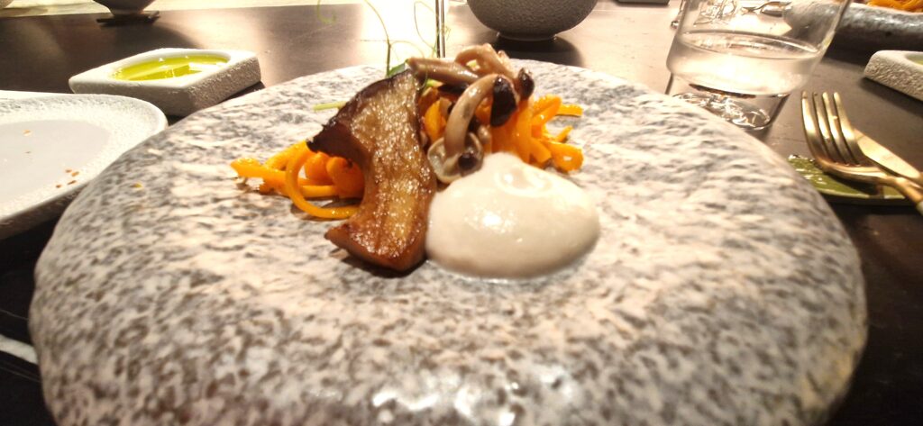 Iniziamo con Umami Vegetale, spaghetti di zucca con il suo dressing fermentato, funghi e mandorle. Descrivere questo piatto ci risulta veramente difficile, lo chef ha saputo annullare le note dolci della zucca spadellandola nella forma di spaghetto (veramente ben fatto) con un dressing di zucca che ha fermentato ben 20 giorni e aggiungendo solo pepe e spezie. L’assaggio ci lascia di sasso, è intrigante, saporito, della giusta consistenza. Un piatto che merita l’applauso.