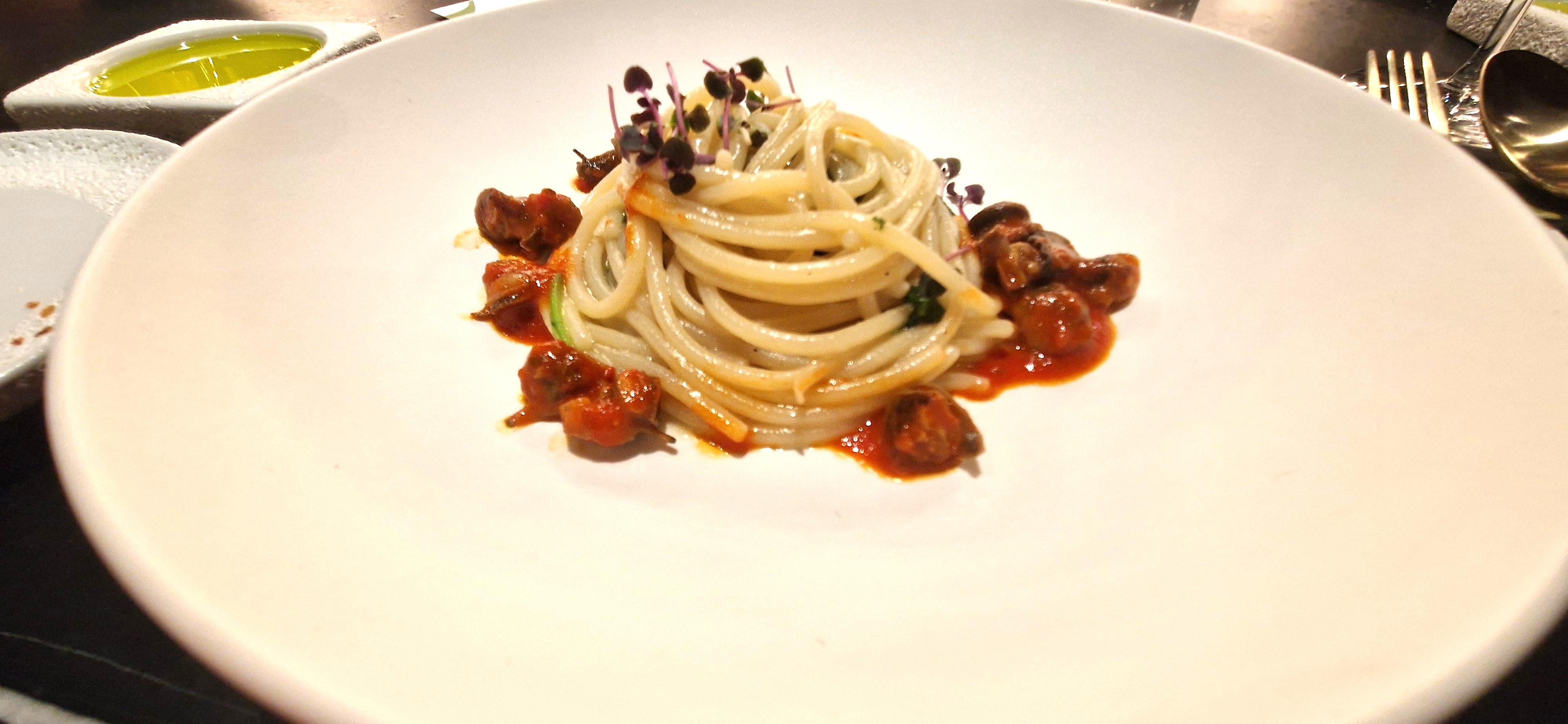 Una pasta dove l’utilizzo del peperoncino non vuole essere incisivo per dar spazio all’utilizzo dei due tipi di lumache danno al piatto sapidità, grazie alle lumachine di mare, e quel sapore di “terra” tipico delle lumache classiche. molto interessante.