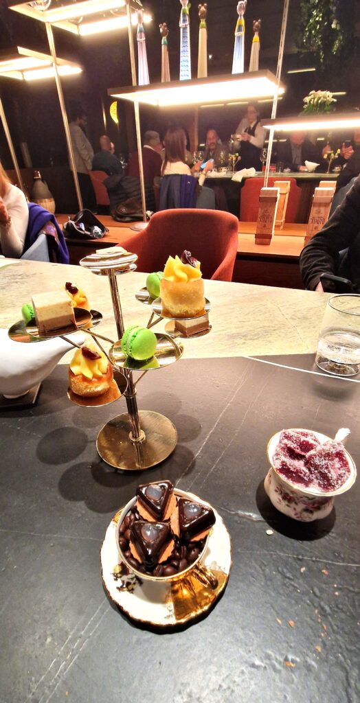 Terminiamo il tutto con un’alzata di piccola pasticceria che allieta il finale della nostra cena.
