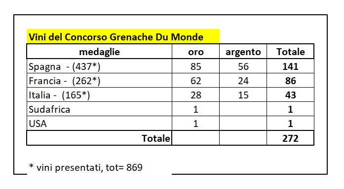 I vini presentati nel concorso Grenache du Monde 2019 sono stati 869, di cui il 50% spagnoli, il 30% francesi ed il 19% italiani. La differenza nel numero di medaglie assegnate ai vari paesi risente ovviamente di questa diversa percentuale di presenza.