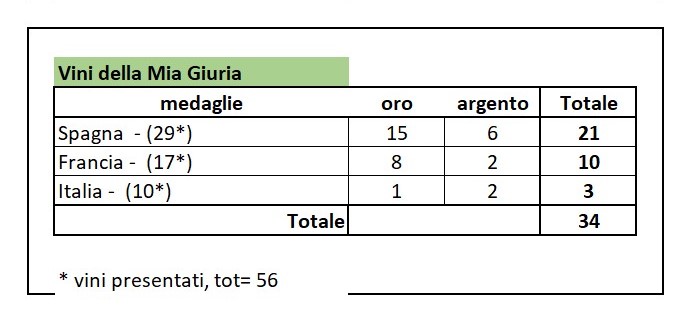 In questo concorso l’Italia occupa “storicamente” il terzo posto sia come vini presentati che come numero di medaglie conquistate ed anche in questa edizione ha mantenuto questa posizione con 43 medaglie acquisite. Di seguito uno schema di sintesi dei vini e delle medaglie assegnate.