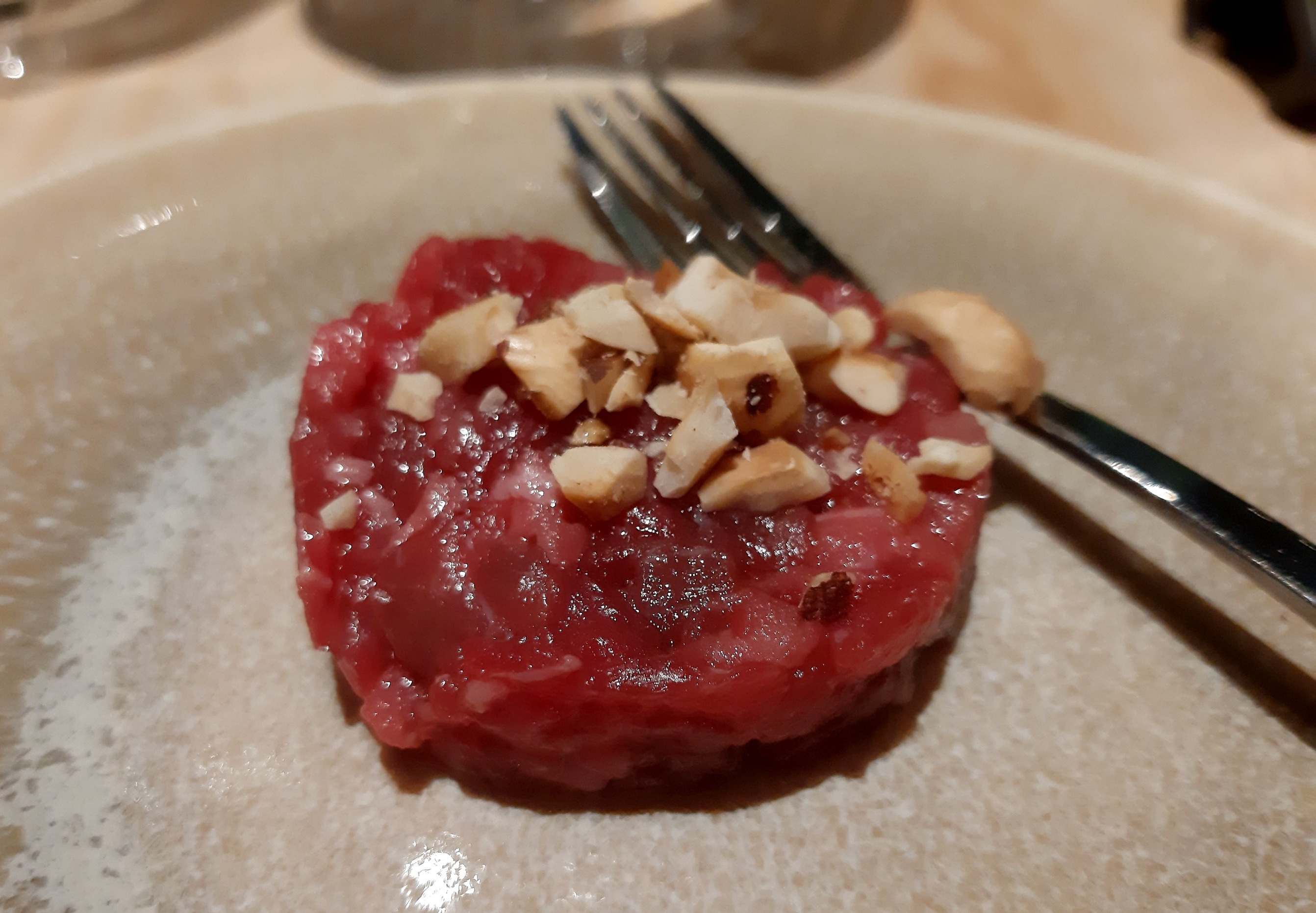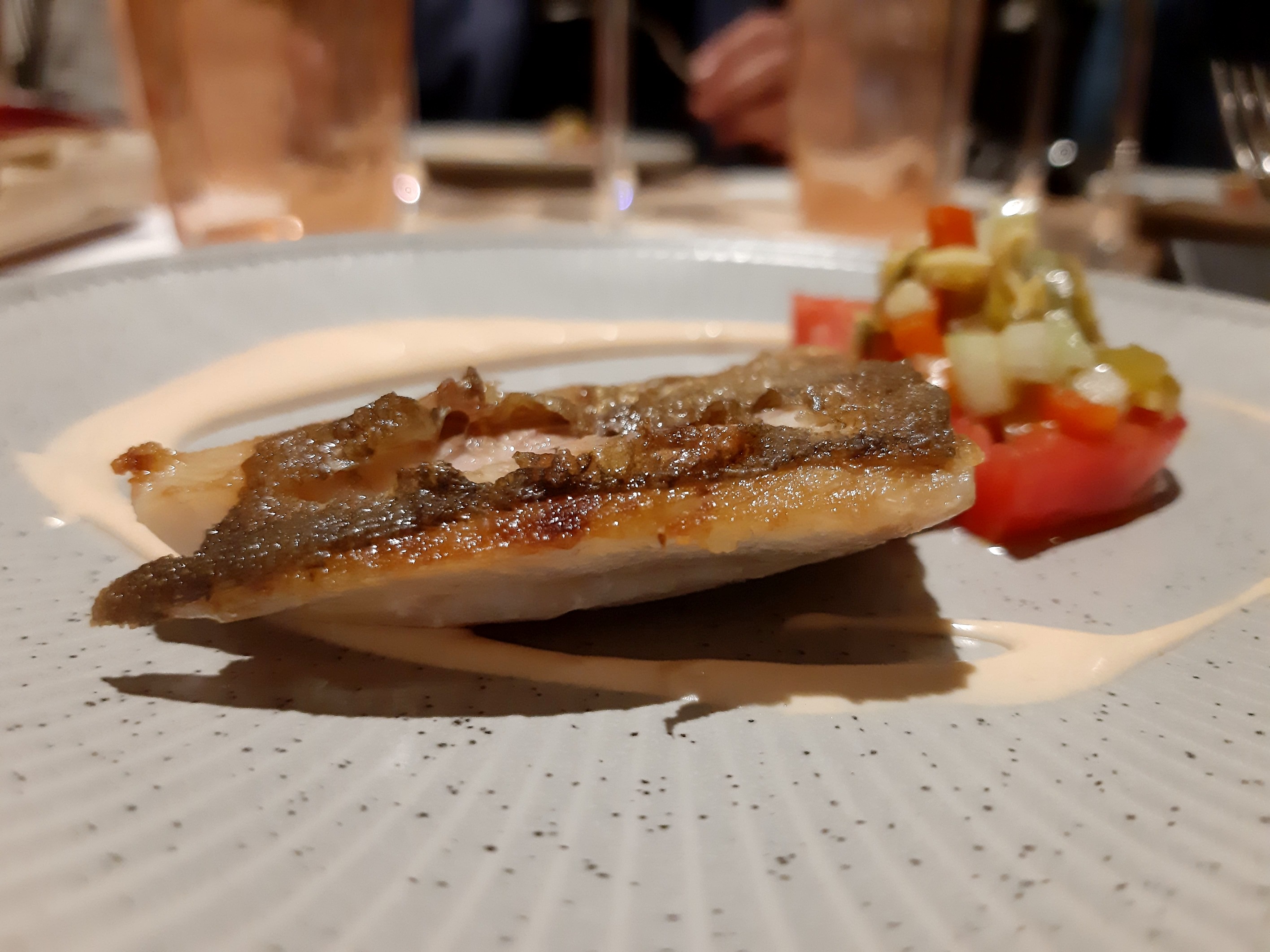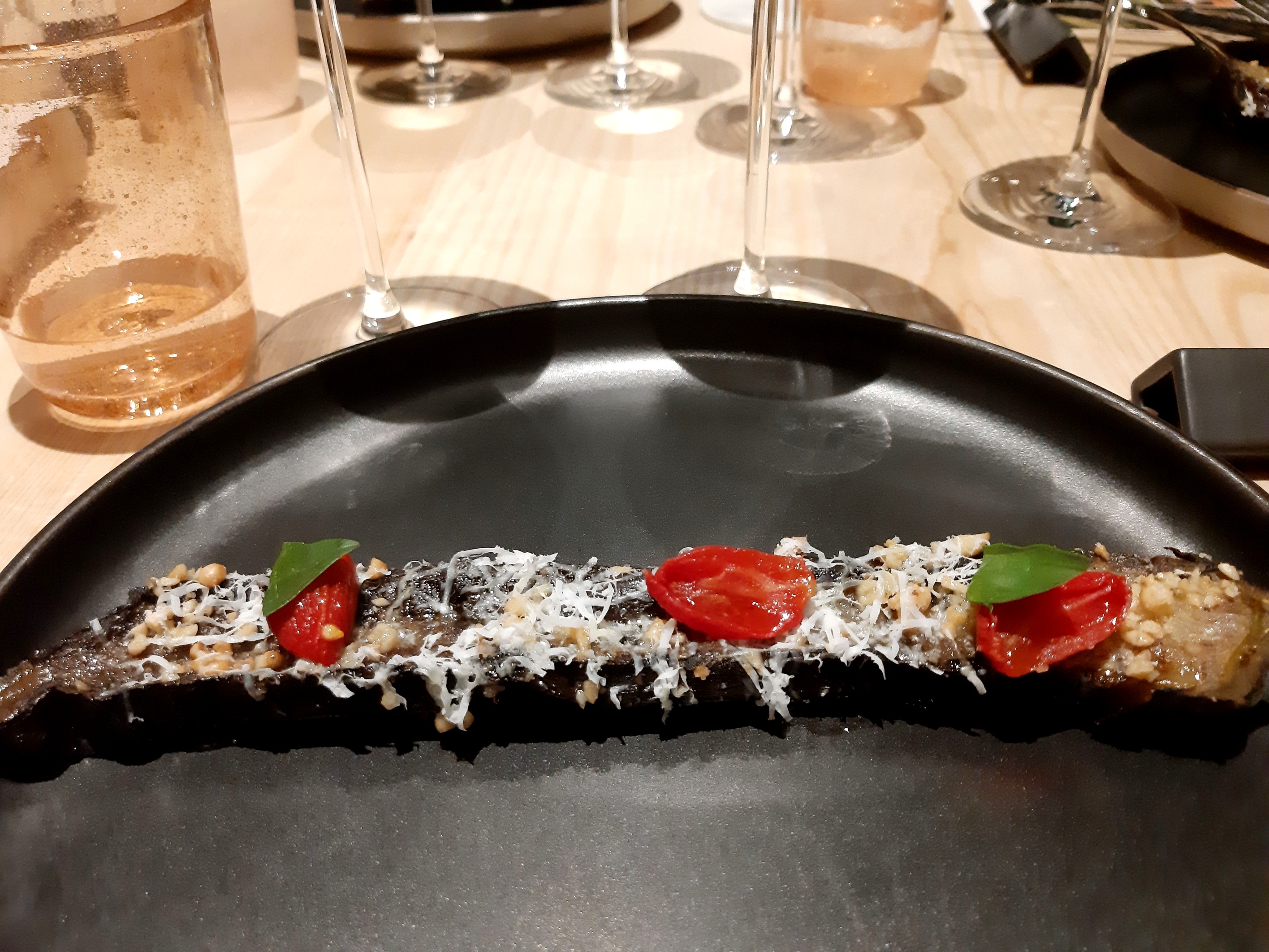 Si comincia dall’entrée a base di tartare di manzo, colatura di alici e nocciole accompagnato dall’allegro Valdobbiadene Extra Dry Giall’oro per proseguire verso la melanzana glassata con pomodorini e ricotta stagionata e lo strepitoso Valdobbiadene Extra Dry 2024 Giustino B. millesimo da tutto pasto. Cinque mesi di Charmat lungo, dedicato proprio al fondatore; vino premiatissimo dalle guide di settore tra cui Gambero Rosso, organizzatore della serata. Dosaggio pari a 17 grammi/litro mai stucchevole e ricca di freschezza e personalità.