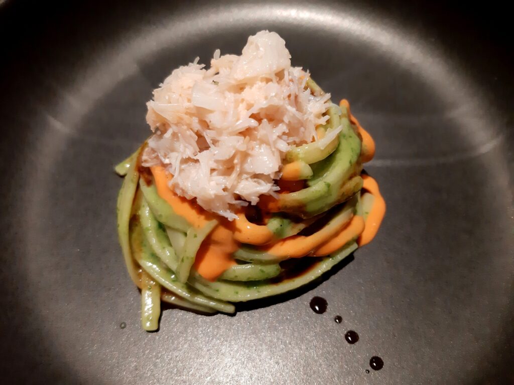 Tra i primi spiccano le linguine tiepide al granchio, pesto di rucola e mandorle, il piatto migliore della serata con la contaminazione in chiave fusion sudamericana tra il crostaceo e la frutta secca, abbinato al Valdobbiadene Brut Quartese