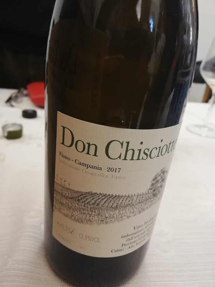 Don Chisciotte 2017. Il Fiano di Pierluigi Zampaglione è sempre una garanzia in termini di eleganza e bevibilità e anche la 2017, pur essendo figlia di un’estate calda, si mostra nel calice in forma smagliante. Giallo dorato con tenui riflessi ramati, un naso decisamente intrigante di cedro e limone sfusato, con netti sentori di menta e fiori bianchi. Freschezza e sapidità sono in perfetto equilibrio e l’alcol che c’è ma quasi non si avverte regala un palato morbido e vellutato. Beva agile e appagante. Ottima la persistenza con un finale di agrumi e note fumé.