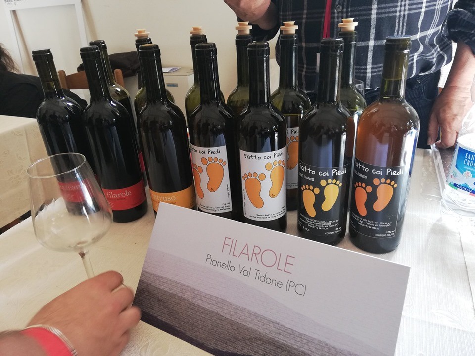 Fatto coi piedi 2016 – Orange wine ottenuto da Malvasia Aromatica di Candia, Ortrugo e Trebbiano Romagnolo in proporzioni più o meno simili (circa 1/3) a seconda dell’annata. Fermentazione spontanea senza nessuna aggiunta in tino aperto fuori cantina. Macerazione di tre settimane con frequenti follature. Svinatura a fermentazione ultimata. Nessun travaso e nessuna aggiunta di solfiti. Affinamento in vetroresina. Delle quattro annate in degustazione (2015, 2016, 2017 e 2018) la 2016 è di gran lunga la più equilibrata e vibrante. Oro luminoso nel calice, con una leggera velatura. Naso ricco che apre su fiori e frutta gialla matura, prima di lasciare spazio a note di idrocarburo e cenni vegetali. In bocca è piacevolmente fresco e sapido, con piacevoli e coerenti rimandi di frutta gialla matura. Molto persistente con un finale intrigante di mandorle amare e sale.