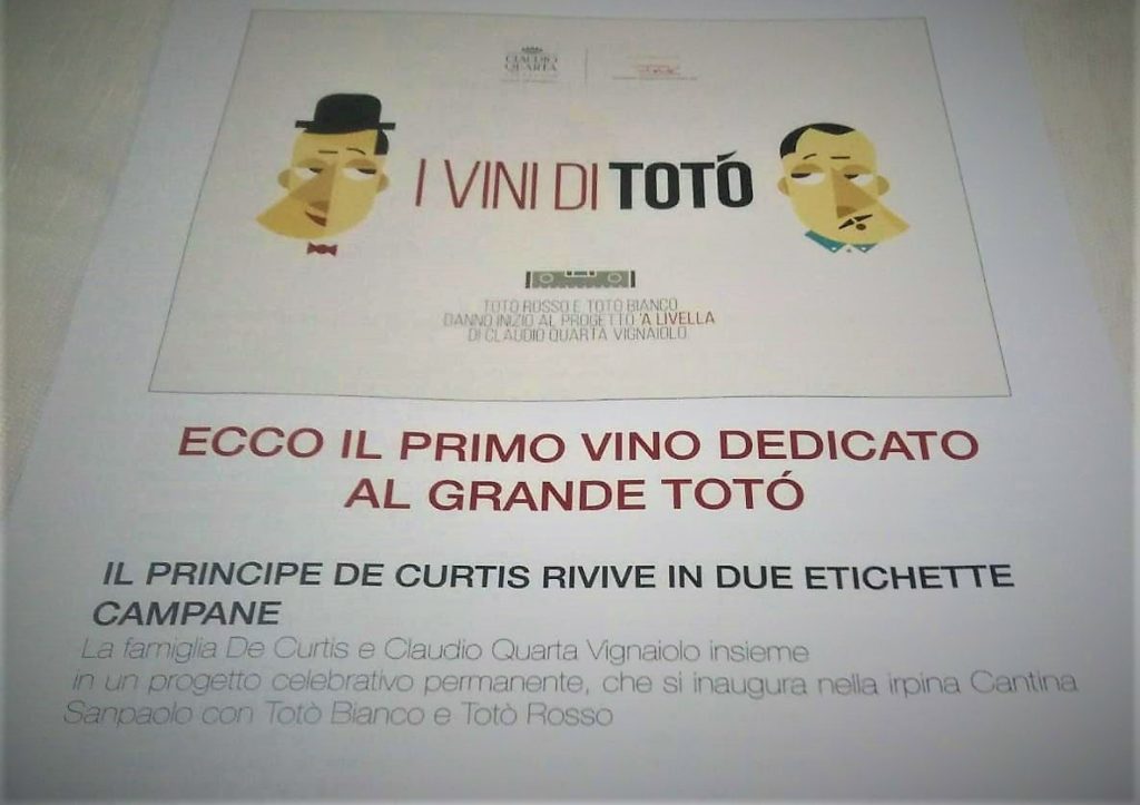 Evocare un personaggio come Totò è un po’ come muovere automaticamente l’anima ed i ricordi di ogni italiano, con in testa gli abitanti della regione Campania. Non immaginare gestualità, battute e giochi di parole, ormai entrati nel linguaggio comune, del celebre attore napoletano è quasi impossibile. Ecco allora che la presentazione del progetto ‘A Livella, che prende in prestito il titolo di una celebre poesia del Principe De Curtis, ha, come era nelle previsioni, riscosso un grandissimo interesse. La famiglia De Curtis (i due nipoti di Totò) e Claudio Quarta Vignaiolo(piccolo gruppo di aziende vinicole facente capo a Claudio Quarta ed alla figlia Alessandra, di cui fa parte la Cantina San Paolo in Irpinia) ha dato vita a questo progetto celebrativo permanente, per il cui battesimo sono nati due vini dedicati al grande artista.