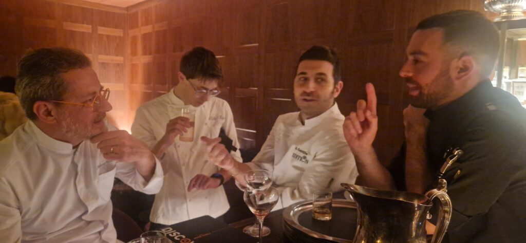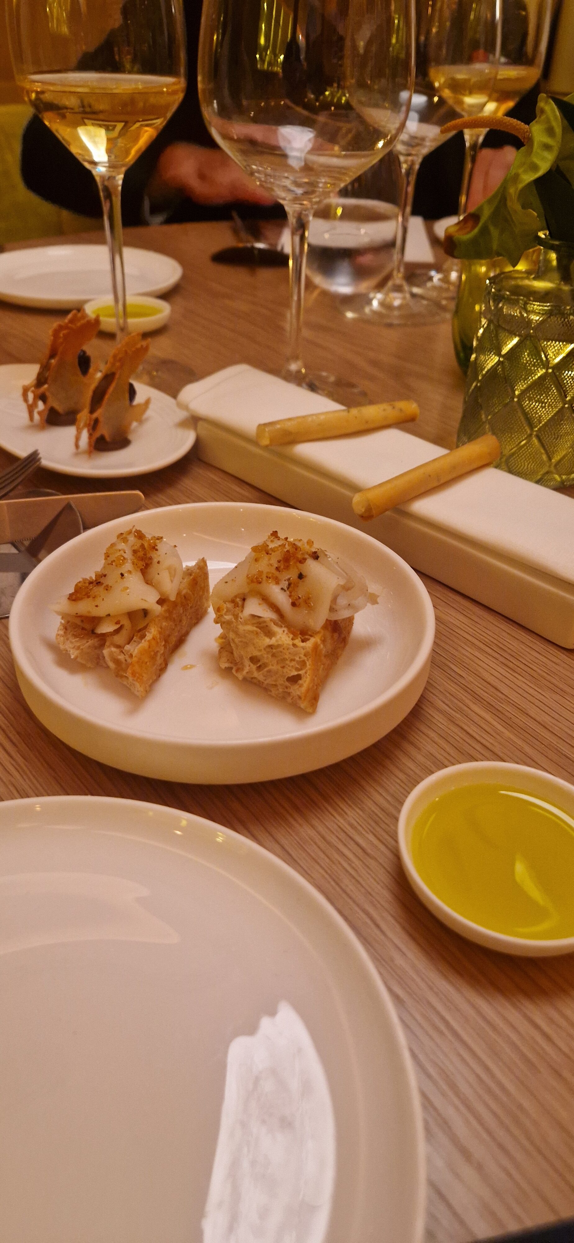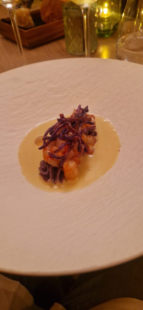 La patata viola, il gambero rosso e il Franciacorta (Cerveni) –e la Passeggiata nel bosco, funghi, castagne e mirtilli (Gentile) a cui Benito Colonna, direttore del ristorante, abbina lo Chardonnay “Selva della Tesa” 2020, abbinamento molto interessante con un vino che sa sostenere appieno entrambi i piatti.