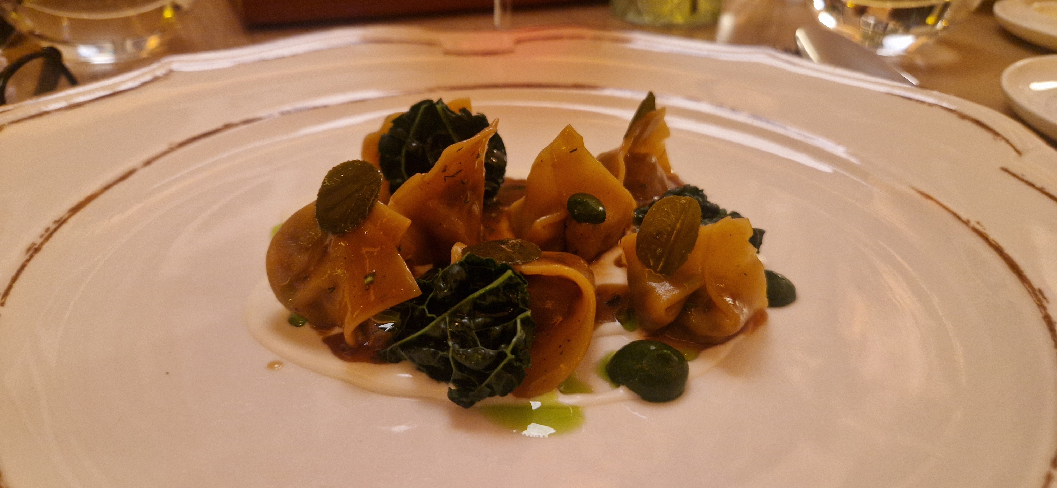 Segue il Tortello di genovese d’agnello, cavolo nero e pecorino (Gentile) accompagnato da Curtefranca rosso “Corte del Lupo” 2022.