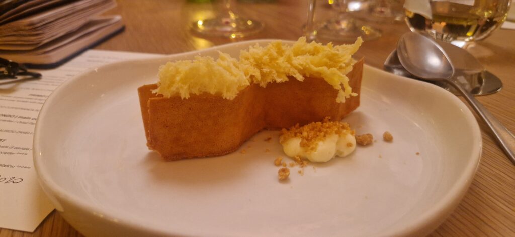 Terminiamo con Shiso, cioccolato bianco, polenta e polvere di caviale (Cerveni) e Idea di pastiera napoletana (Gentile) abbinati al Vintage Pas Dosè 2020, un finale che vuol essere sbarazzino attraverso questa bollicina fresca e inebriante.