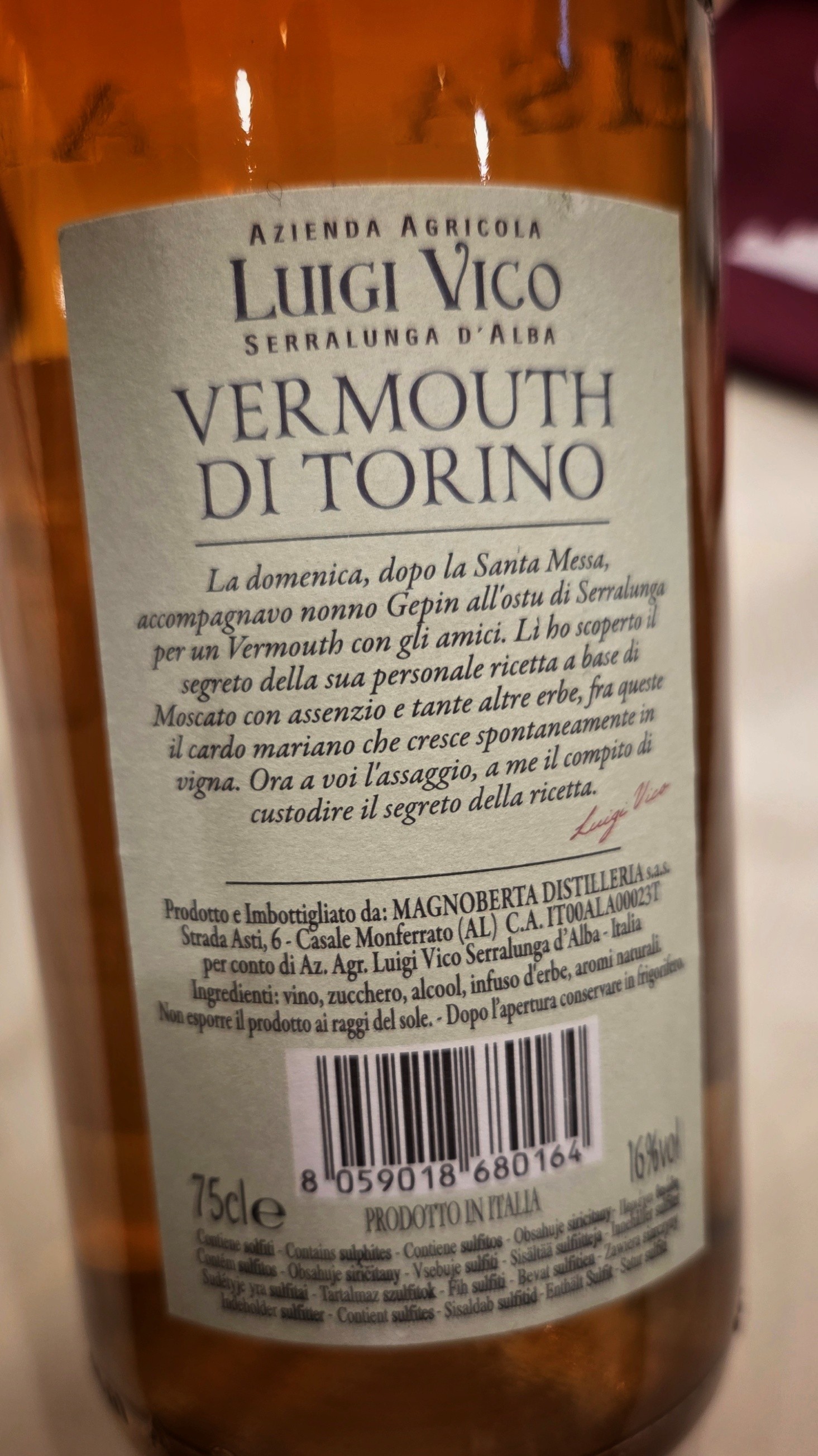 “La domenica, dopo la Santa Messa, accompagnavo nonno Gepin all’ostu di Serralunga per un Vermouth con gli amici. Lì ho scoperto il segreto della sua personale ricetta a base di Moscato con assenzio e tante altre erbe, fra queste il cardo mariano che cresce spontaneamente in vigna. Ora a voi l’assaggio, a me il compito di custodire il segreto della ricetta”