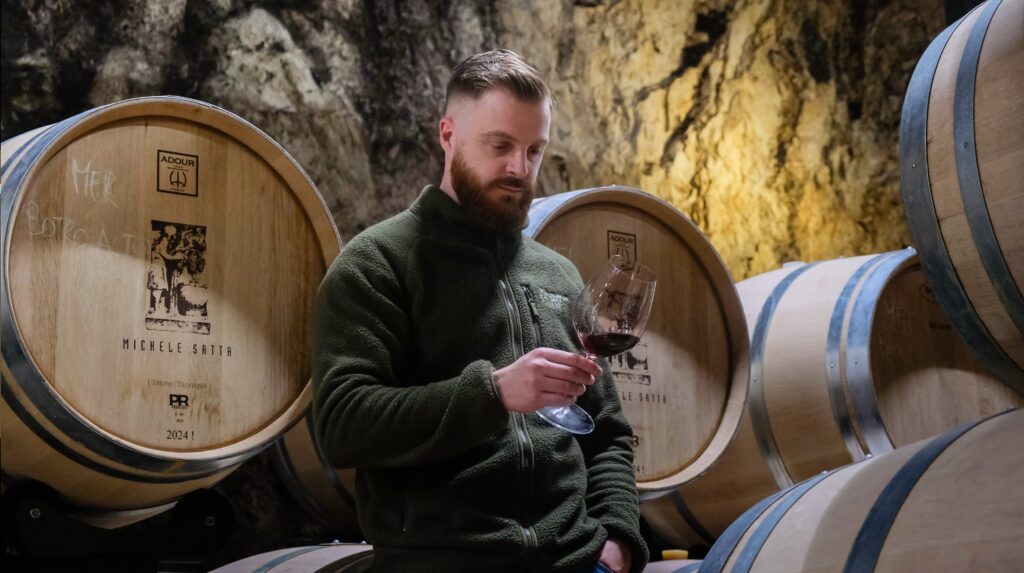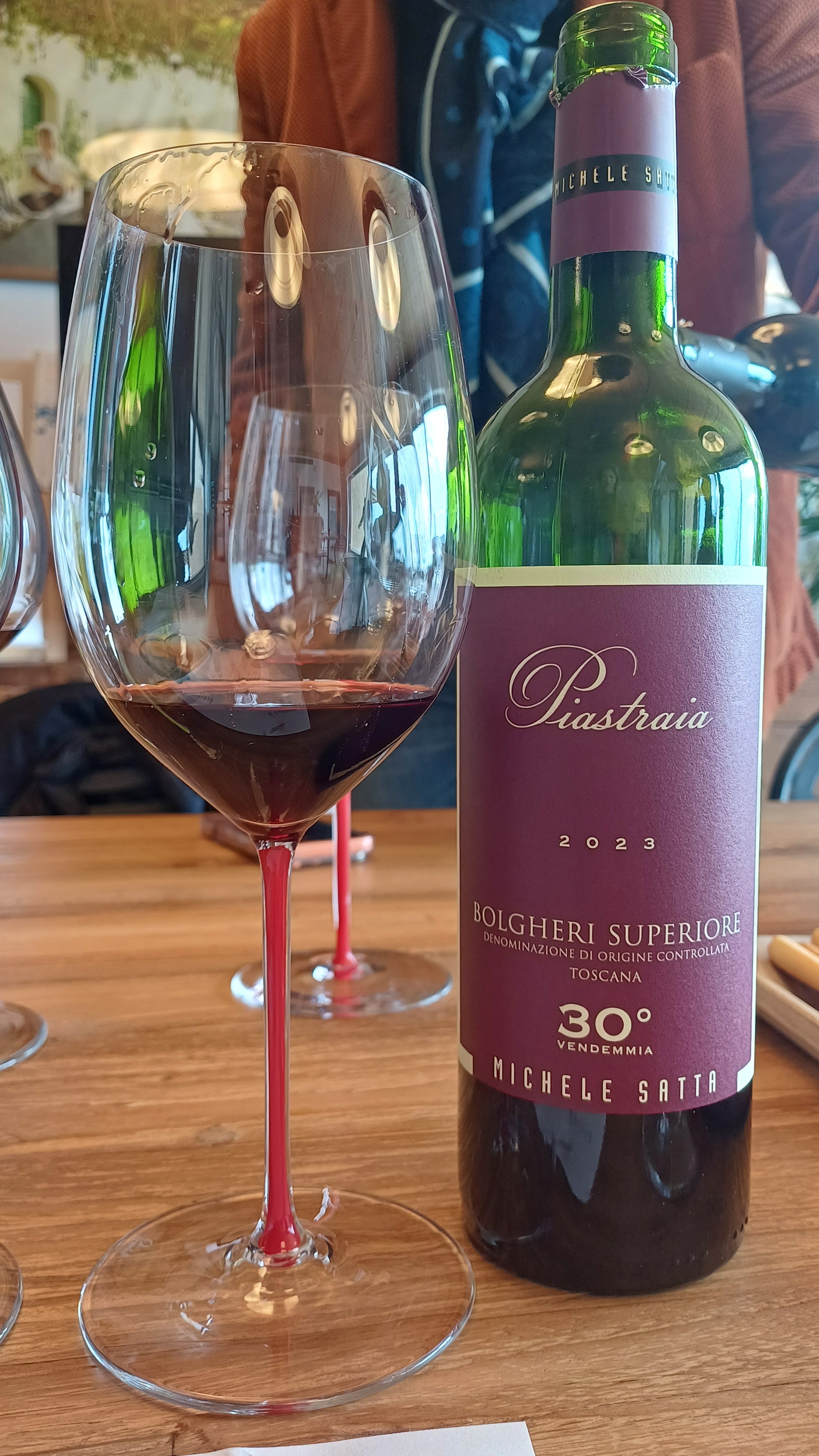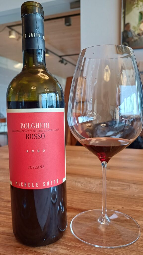 Arriviamo a Piastraia, Bolgheri Superiore Doc, 2023, trentesima annata del vino e flag ship dell’azienda. Dai migliori vigneti di Cabernet e Merlot, si rinuncia al Sangiovese dalla 2023, e si punta sul potenziale del Cabernet Franc, piantato nel 2018. Michele ha sempre creduto tanto nel taglio di Sangiovese e Cabernet, per unire la mediterraneità all’anima bolgherese. Ma una presa di responsabilità ha portato a produrre Bolgheri, facendolo “sul serio” e con lo stile Michele Satta. Si è mantenuta la freschezza grazie a un Franc che porta acidità piena e verticalità nel taglio, quello che svolgeva il Sangiovese. E qui sulla 2023 il disegno si consolida pienamente. Il Cabernet Sauvignon è al 60% e fa la sua parte in un vino di grande personalità.