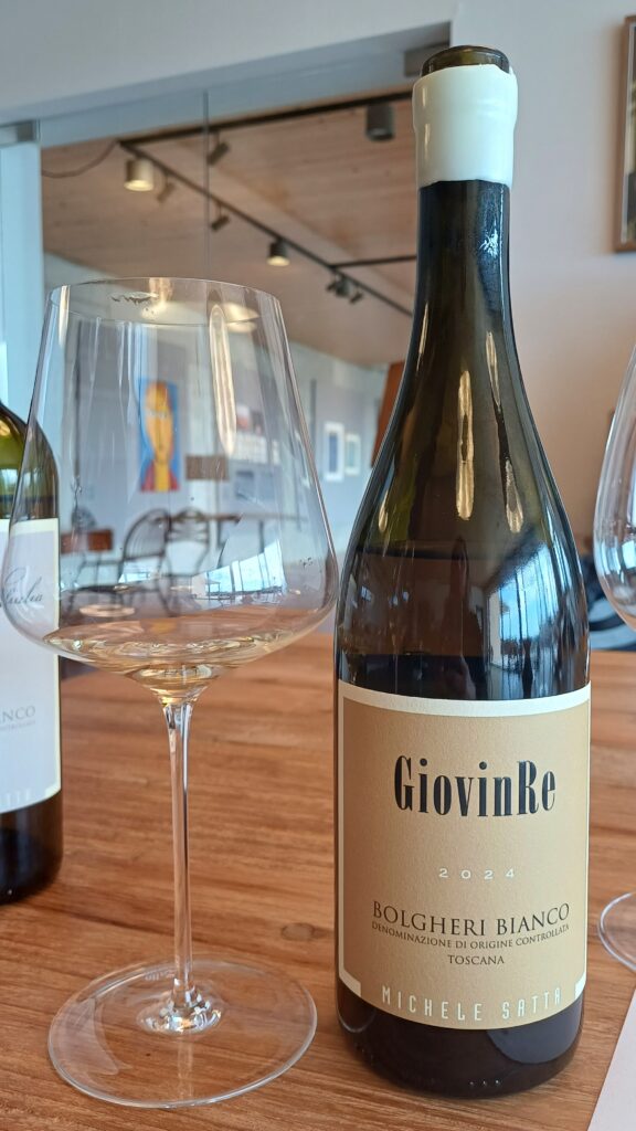 GiovinRe, Bolgheri Bianco Doc 2024, una magnifica espressione di Viognier in purezza che qui viene curato al minimo dettaglio per evitare che la sua labile acidità decada prima del tempo. Nelle annate è cambiato molto, la prima vendemmia segnata dall’anfora, la seconda dal cemento e 2/3 in barrique, la 2024 ha consolidato l’idea di anfora e cemento. Il vino risulta agrumato, con sentori erbacei, forti sensazioni aromatiche, il finale lungo e discretamente balsamico, masticabile, un vino gustoso e di impatto morbido sul finale.