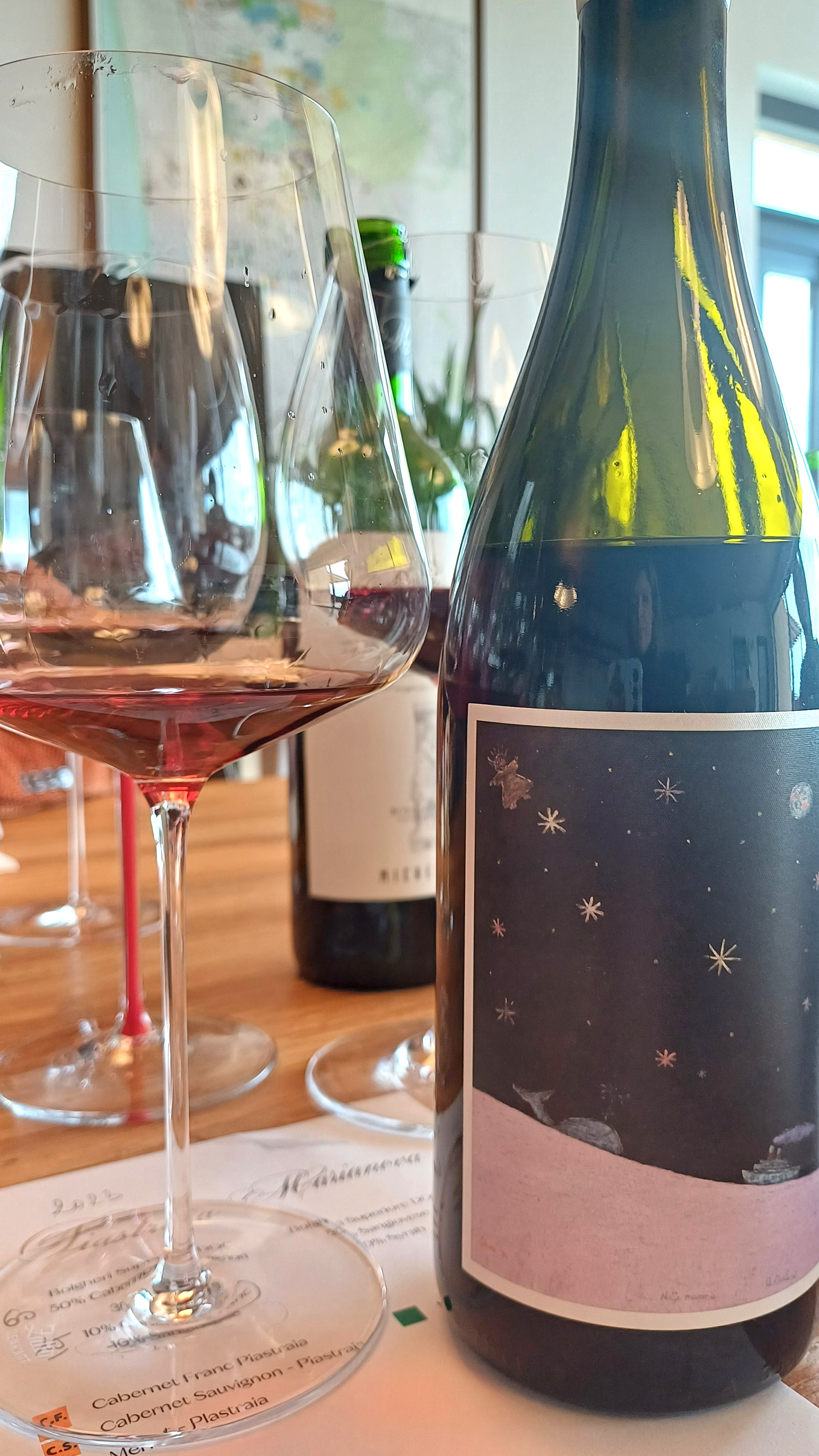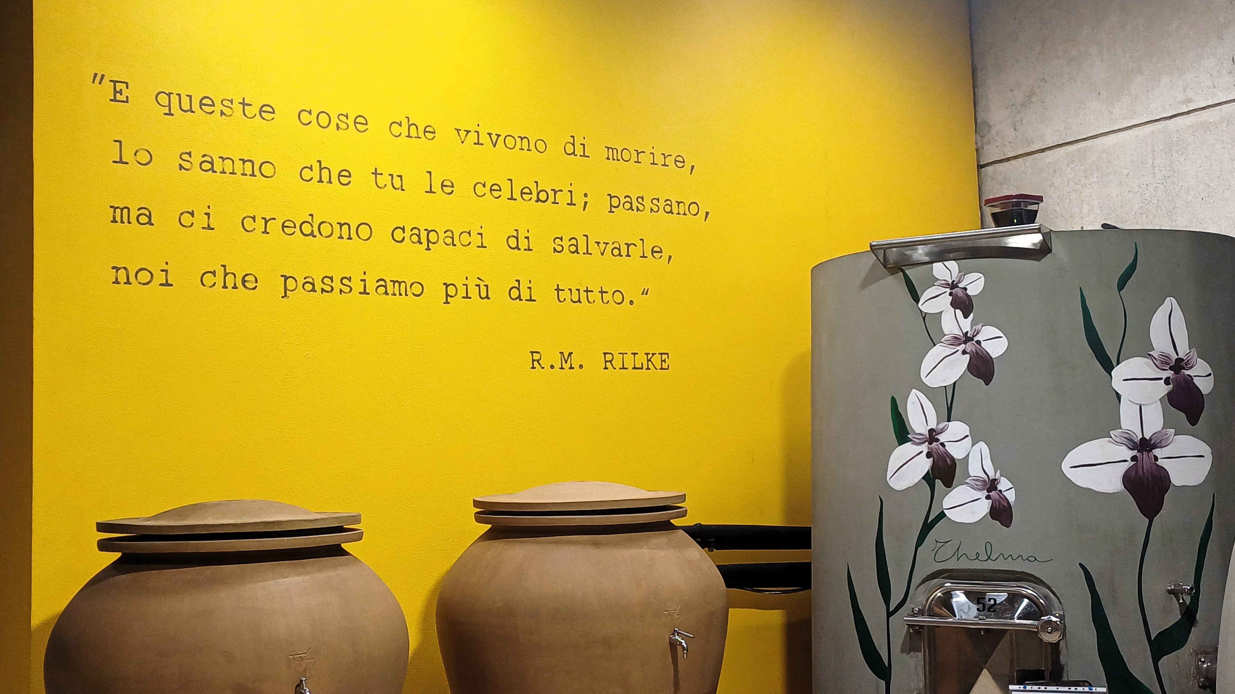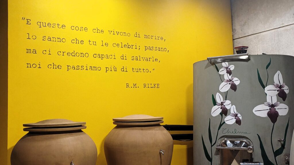 La degustazione si sposta al piano di sopra nella elegante e sobria sala che sprofonda, con le sue ampie vetrate, fino al mare. Prima dei calici però un breve passaggio virtuale in vigna, perché qui di tecnologia si parla, non solo di visioni tradizionali.
