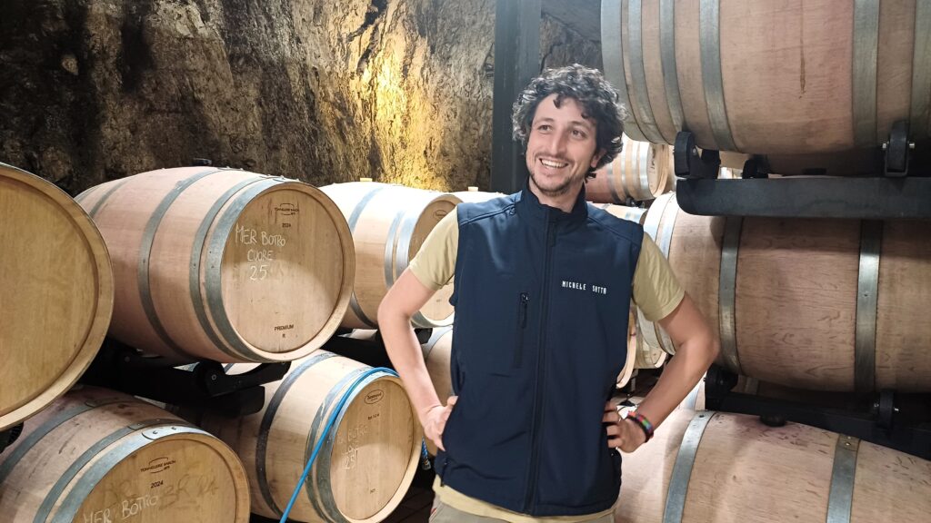 Assaggio fuori schema è la Grenache, Notte Marina, 2023. Meno di un ettaro di una varietà che permette un gioco molto abile e per adesso due annate, la 2023 è la prima. Sull’etichetta, intanto, un quadro di Giampaolo Talani (noto pittore di San Vincenzo, Livorno) senza altra indicazione. Il retro racconta un vino che fa anfora, barrique esauste e fermentazione a grappolo intero. Qui non parla Bolgheri ma si spalanca un altro universo. L’idea della grenache è un furto di diritto d’autore a Meletti Cavallari il genio di Grattamacco che dopo essersi spostato all’Elba aveva piantato grenache, una varietà molto mediterranea e resistente al caldo e a cui Michele Satta non ha tardato ad affezionarsi, piantandolo a sua volta nel 2018. Ha una vigoria incredibile, diversissimo dal Franc, e il risultato è un vino caramella, succoso, fresco, fruttato. Colore pieno, sorso avvolgente, emozionante.