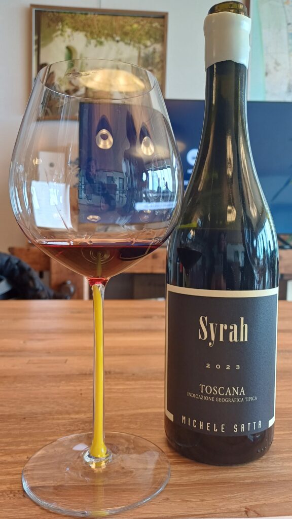Syrah, Igt Toscana, 2023, 4000 bottiglie l’anno, dalla Vigna Castagni, la più vecchia nel blocco originario dell’azienda, fermentazione a grappolo intero per il 30% con la differenza che la scelta dei legni va a seconda dell’annata. La 2023 è senza legno. Il resto lo fanno cemento e anfora. Lavoro in vigna di grande selezione dei grappoli. Questo vino è un’interpretazione moderna del Syrah, accodandosi a uno stile delle parti fresche del Rodano. Quindi, niente concentrazione e piuttosto ricerca al naso di una certa parte bruciata che richiama alla terra. Presenti frutta rossa e prugna secca ma lungi dalla marmellata. Un vino eccezionale.
