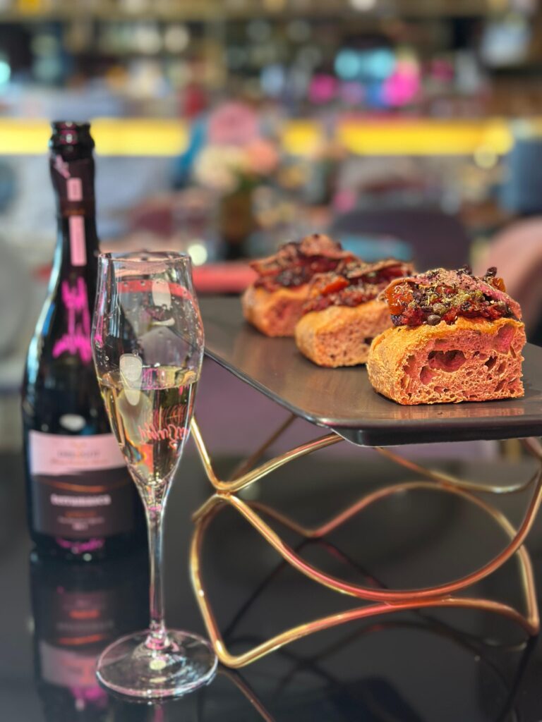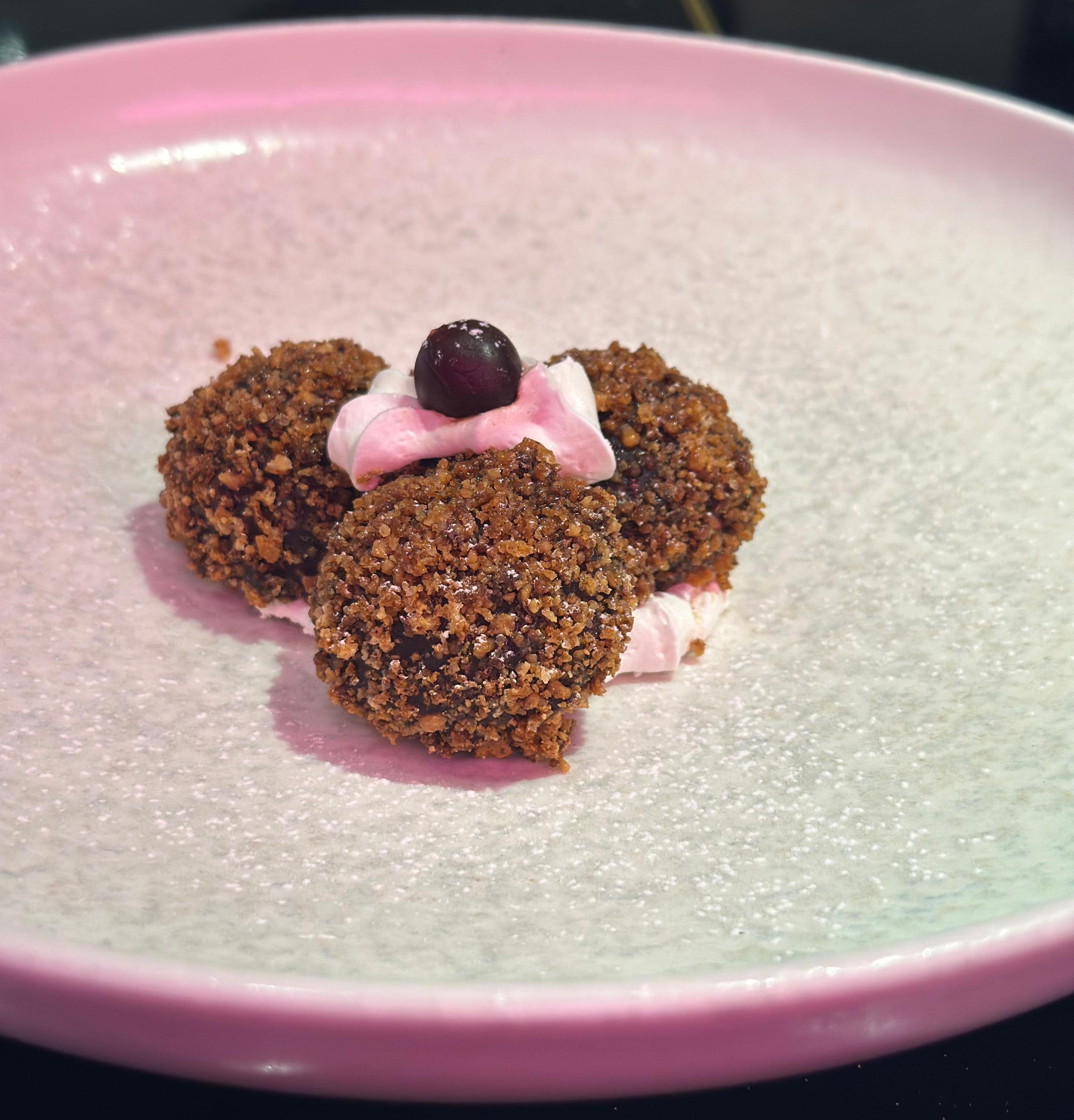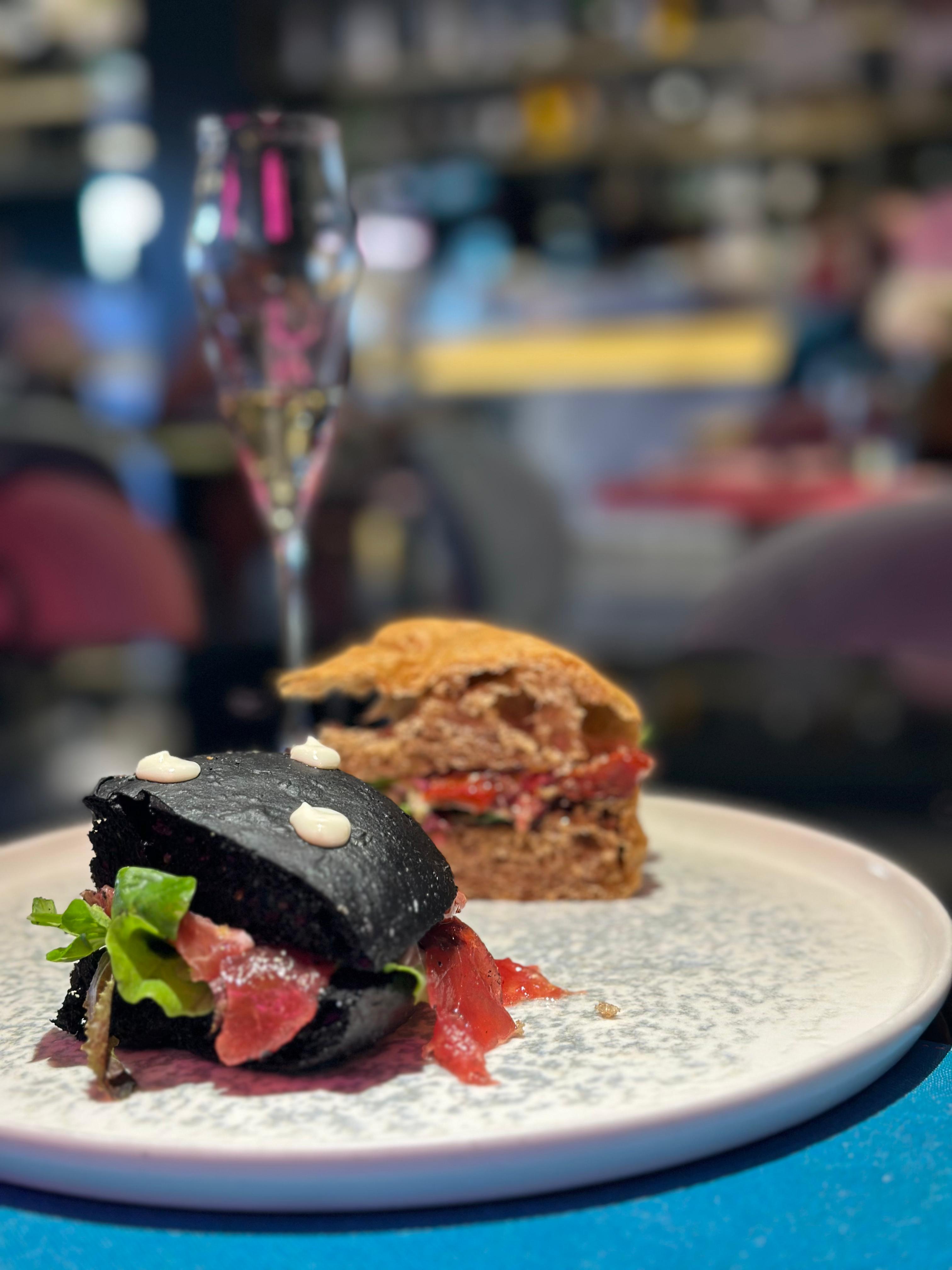 Elegante il duetto “manzo in crosta” e “mare in crosta”, le due gemelle diverse: la prima composta da misticanza, maionese agli agrumi e tartare di Fassona e la seconda, superba, da impasto al nero di seppia, misticanza, tonno rosso, maionese al limone e uva Aglianico.