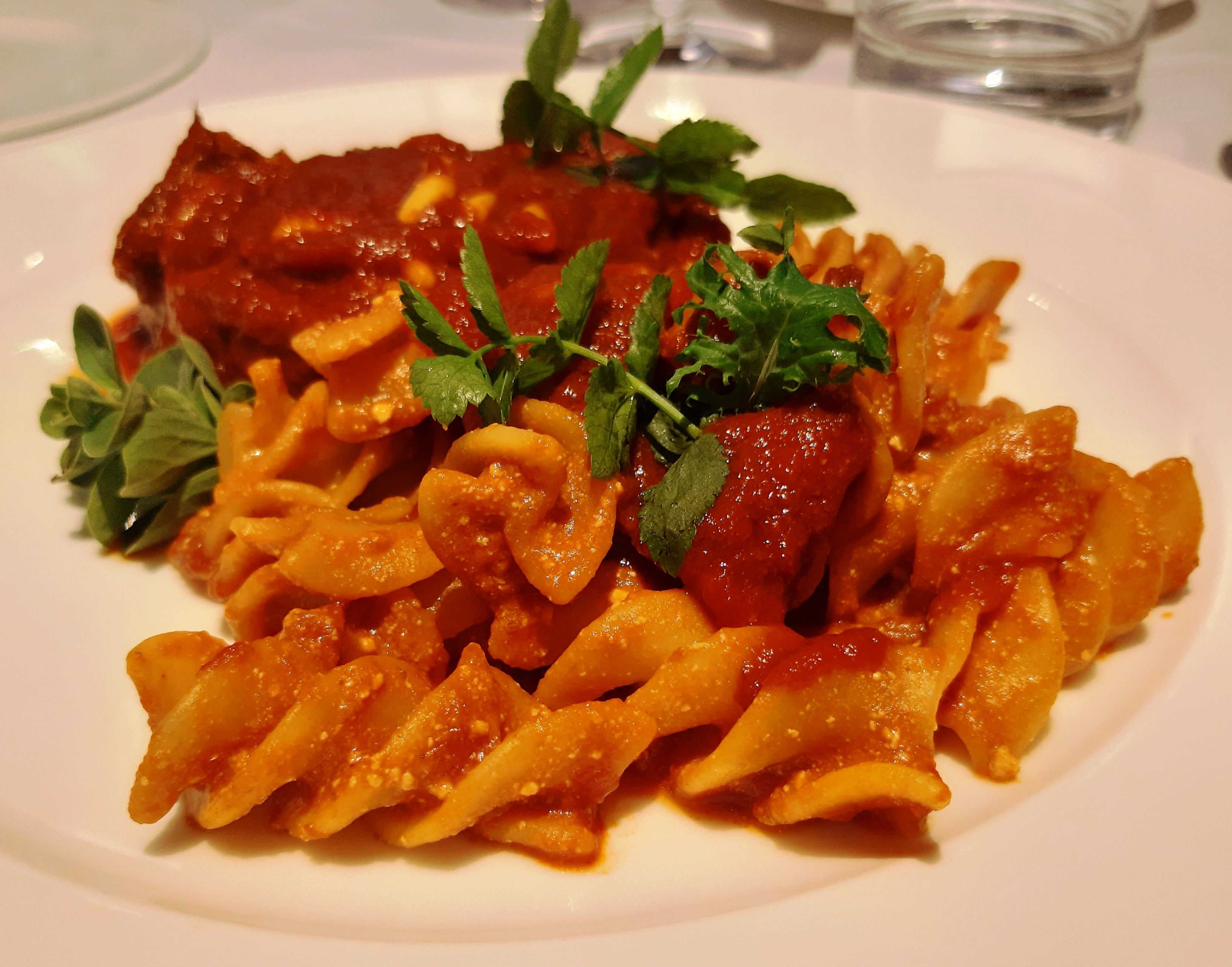 Lo special composto da fusilli di pasta artigianale al ragù napoletano con pomodori, ricotta e la braciola di bovino con uvetta e pinoli, rappresenta l’idea del piatto tradizionale della domenica coi parenti e diventa qui la Madeleine de Proust dal timbro tipico di una ricordo senza tempo, con tanto di inevitabile scarpetta finale su fetta di pane.