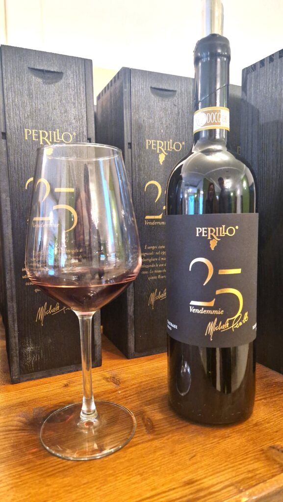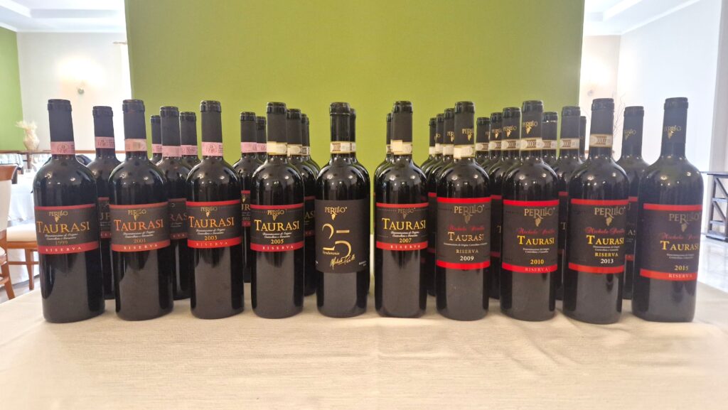 Non capita tutti i giorni di prendere parte a una verticale di dieci annate del Taurasi Riserva di Perillo. L’occasione: la celebrazione delle prime venticinque vendemmie della cantina che ha ormai segnato il passo nella vinificazione e nell’affinamento dell’Aglianico. Tanti infatti gli anni trascorsi da quando Michele Perillo lascia un posto in fabbrica e con l’aiuto dell’enologo Carmine Valentino decide di dedicarsi in prima persona alla vigna e alla produzione di un Taurasi imbottigliato, anziché conferire le proprie uve come fatto fino a quel momento.