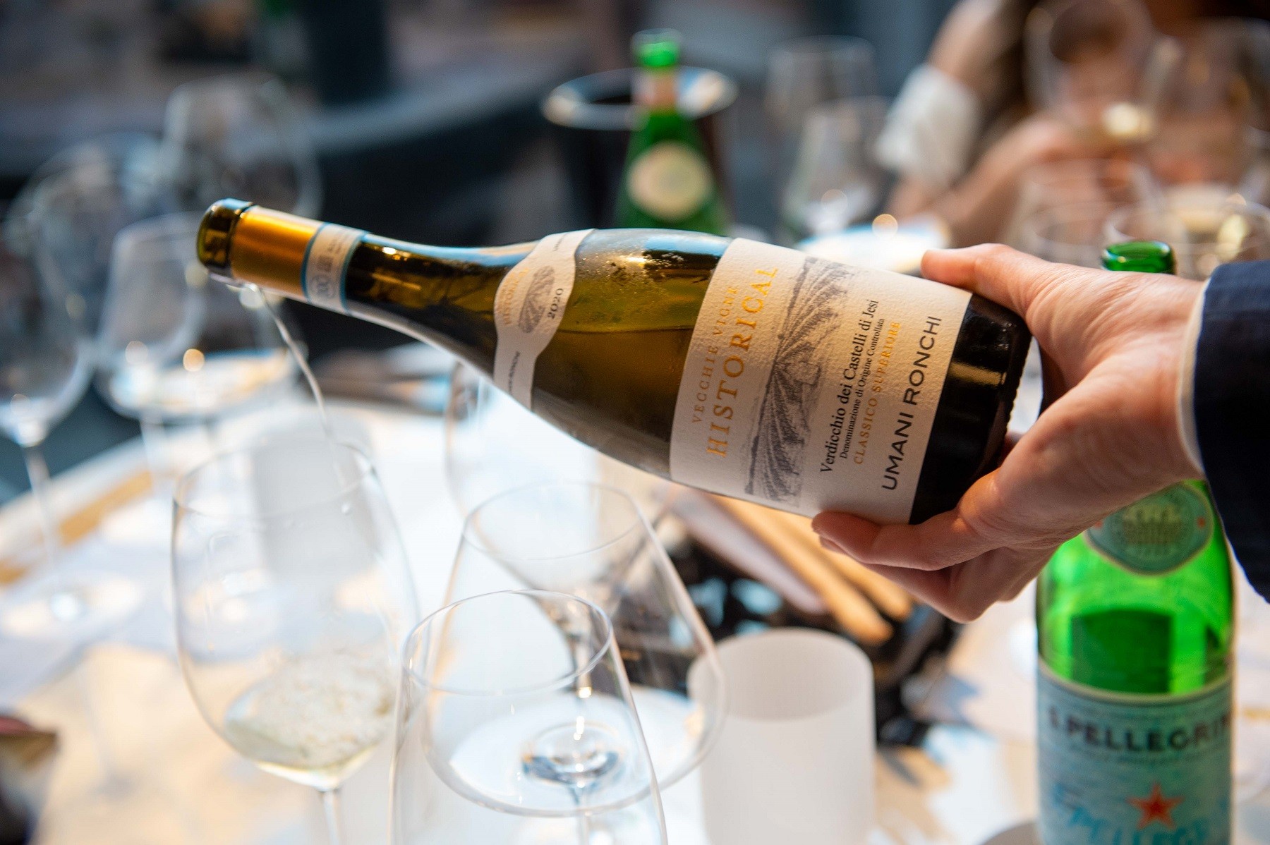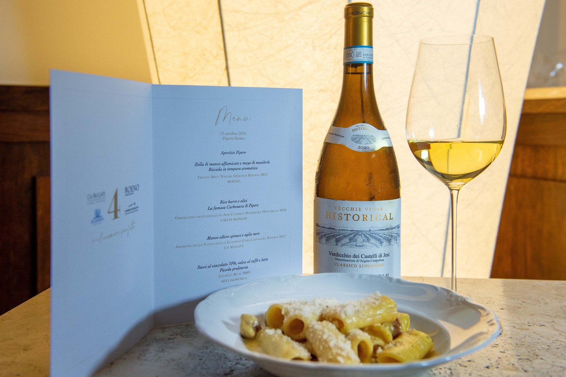 Ci preme arrivare a uno dei vini migliori della degustazione, Verdicchio dei Castelli di Jesi Classico Superiore Historical 2020, Umani Ronchi. Etichetta giovanissima di un’azienda che è vera storia delle Marche vinicole, a Cupramontana dove pulsa il cuore del Verdicchio Classico. Massima espressione di vino da invecchiamento, giallo oro brillante, spinta verticale al naso che lancia direttamente sulle sponde delle terre dove si produce quest’uva. Il carattere è minerale, sapido, salmastro sul finale pulito. Complesso ma anche scorrevole nella beva, senza cadere nella banalità, si arricchisce di note agrumate profonde e cedro. Abbinato al riso con burro aromatizzato al whisky e alici, e poi alla famosa Carbonara di Pipero dove il rosso d’uovo è una crema burrosa e piena, il guanciale croccante ha la struttura di una caramella, un dado sapido che si scioglie in bocca, accompagnato dal sorso ampio del vino, è un vero susseguirsi di ampiezza gustativa e piacevolezza.