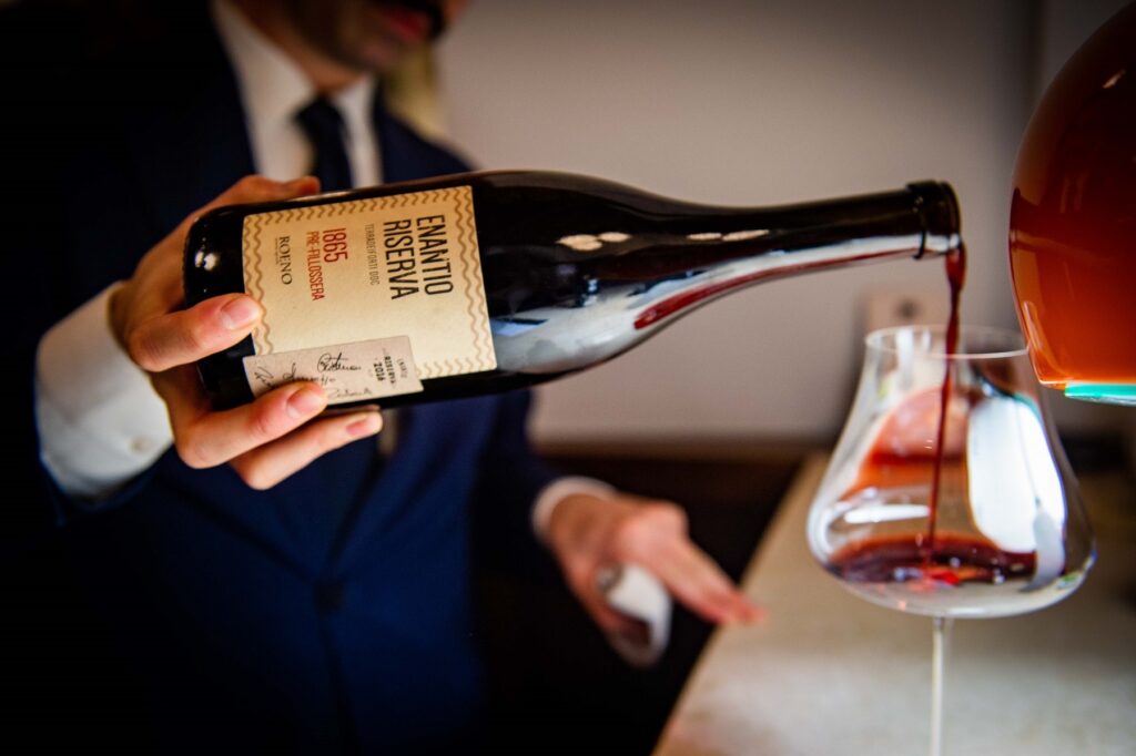 Senza timore anche 1865 Pre-fillossera, Enantio Riserva 2016, Roeno. Annata grandissima, equilibrata. La varietà è autoctona, su un vigneto di due ettari, interamente franco di piede. Il terreno è sabbioso, ricco di silicio, in etichetta si legge 1865 che è la data di nascita delle viti. La vinificazione è esatta e volta a esaltare ogni dettaglio del vino. Connotato da note speziate, il naso è intenso, complesso. Un vino concentrato di materia, sale, acidità e di trama tannica. La pulizia del gusto è perfetta, il frutto non cede, il tannino si allarga nella bocca, in maniera unica e originale. Integro, se pensiamo a quanta storia precede questa etichetta.