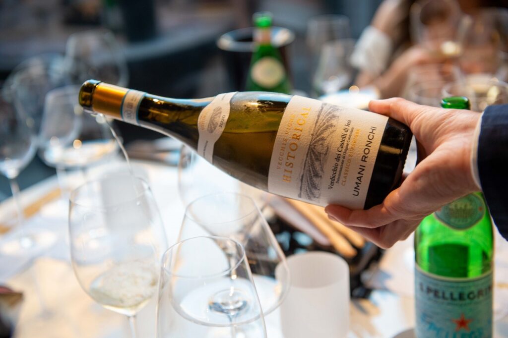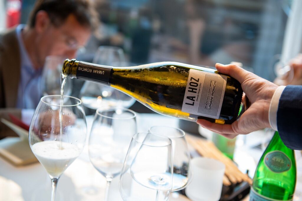 Di Umani Ronchi vi raccontiamo anche il Metodo Classico, la Hoz Nature 2018. Il progetto dello Spumante è nato nel 2008, non con la scoperta di nuove uve ma sul solco di una spumantistica che nelle Marche affonda parecchio indietro nel tempo. Non stiamo a dirvi troppi dettagli ma basta sapere che nel 1500 fu scritto nelle Marche un volume sulla rifermentazione in bottiglia, il metodo Scacchi (autore del libro), ancor prima di Don Perignon. Si infonde eleganza come cifra aziendale, utilizzano uve Verdicchio all’80% e il resto Chardonnay che affina in tonneau. L’affinamento sui lieviti è di 50 mesi. Un vino che rompe gli schemi, il primo Nature nella regione, espressione di una matrice territoriale marcata, a livello olfattivo si sente pienezza, materia, struttura, giocato su freschezza sapida. Una silhouette molto equilibrata, grandissima bollicina.
