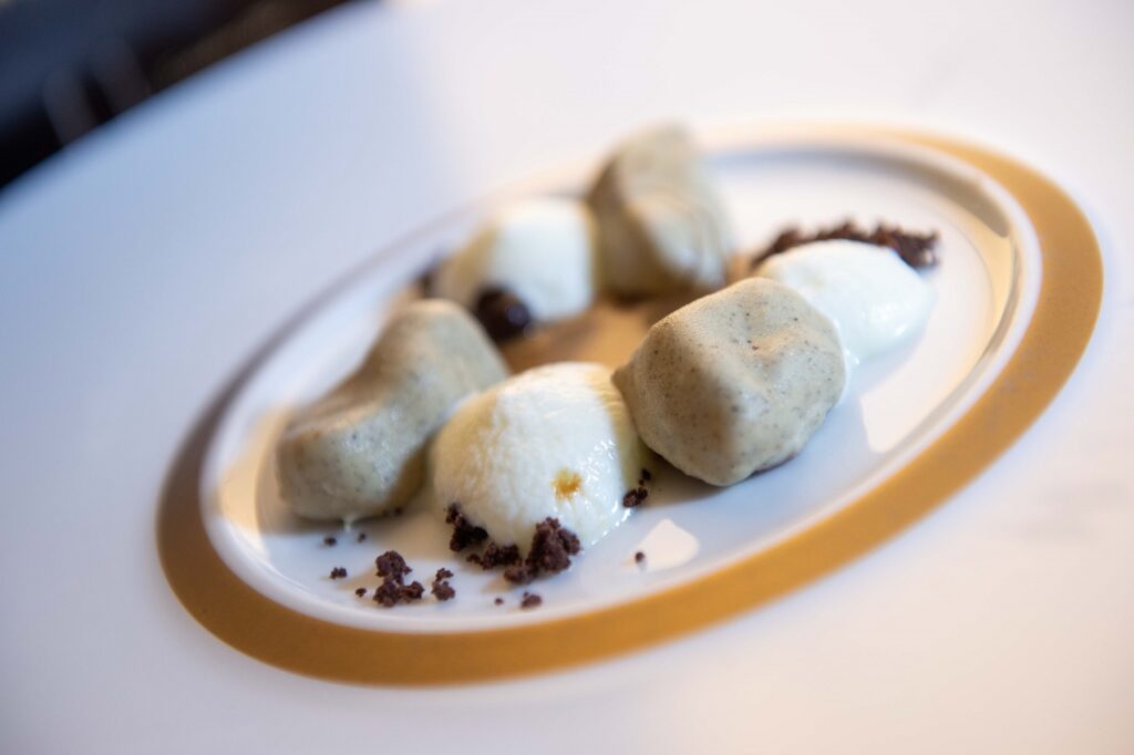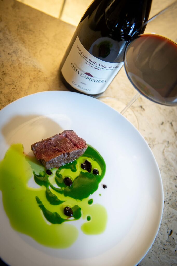 Il manzo (frisona laziale) agli spinaci viene servito con aglio nero e olio all’alloro, e si abbina bene a Amarone della Valpolicella Classico Cima Caponiera Riserva 2017, Cà Rugate. L’azienda racconta un secolo dell’Italia vinicola, a Montecchia di Crosara, in provincia di Verona. Un albero genealogico che parte da Amedeo, e fino ad oggi, con circa 90 ettari, produce etichette tra Soave Classico, Valpolicella e Lessini Durello. L’annata è già stata una bella sfida ma questo Amarone cerca di trovare un’altra strada, cioè un vino, pur frutto dell’appassimento, che va per un percorso proprio senza snaturare quella che è la sua tendenza. Si esprime con sentori di ceralacca, smalto, note eteree, non mancano i piccoli frutti rossi, la ciliegia e a seguire note speziate (zenzero e pepe), piacevoli le sensazioni di agrume. Quello che stupisce è la bocca, fresca, con tannino sottile, un sorso fragrante e raffinato, che mantiene intatto il frutto maturo ma non arriva a confettura. Un “ritorno alle origini”, agli anni ’70 (quando la maturazione non arrivava mai grazie a un clima più clemente ed i produttori non cercavano a tutti i costi vini eccessivamente morbidi), fatto dalla testa di un produttore che cerca tensione e attitudine alla snellezza. L’altitudine della vigna (anche lontana dalla cantina) aiuta e qui si sceglie di valorizzare l’eleganza e meno la potenza, arrivando a maturazioni complete.