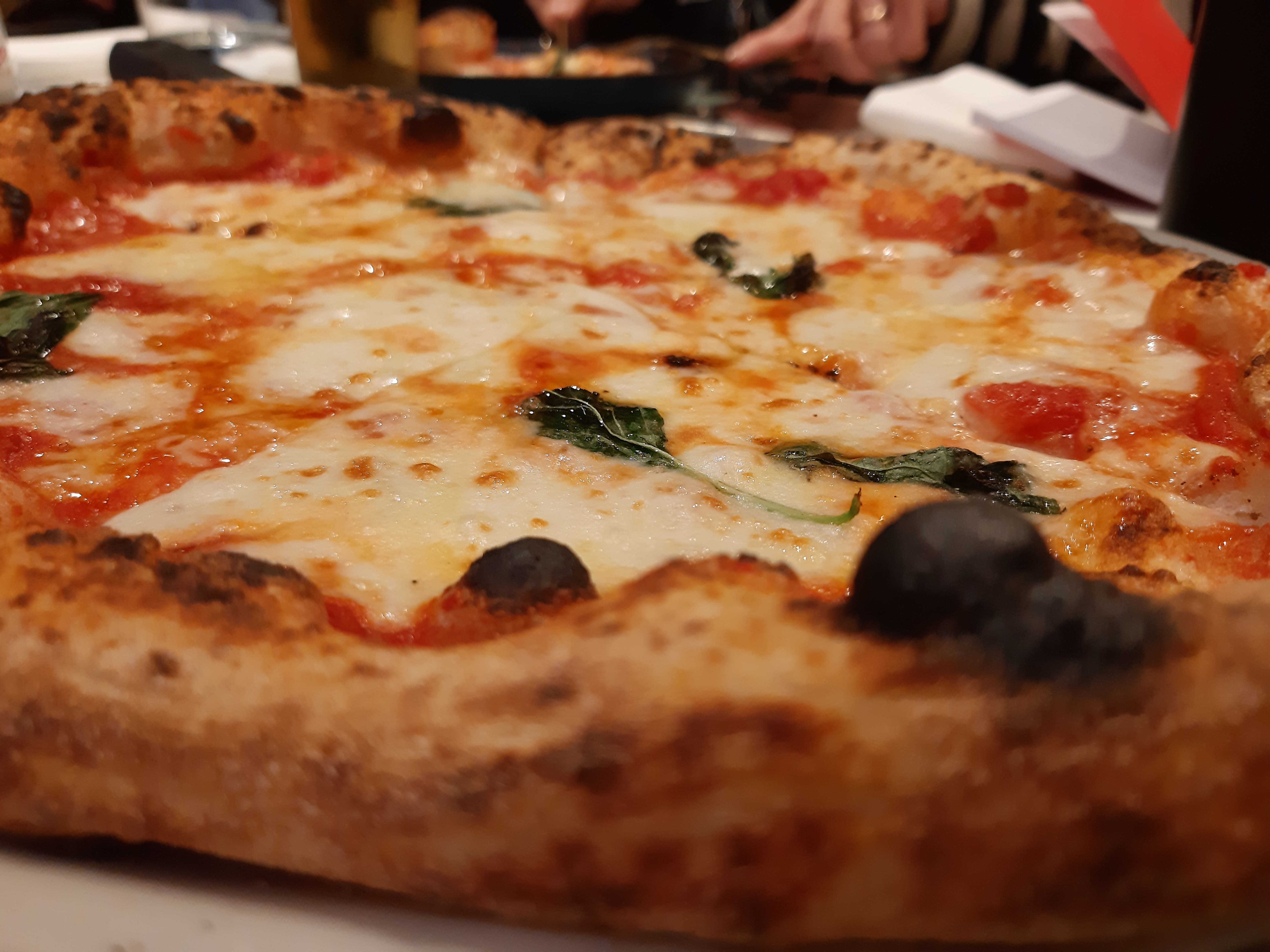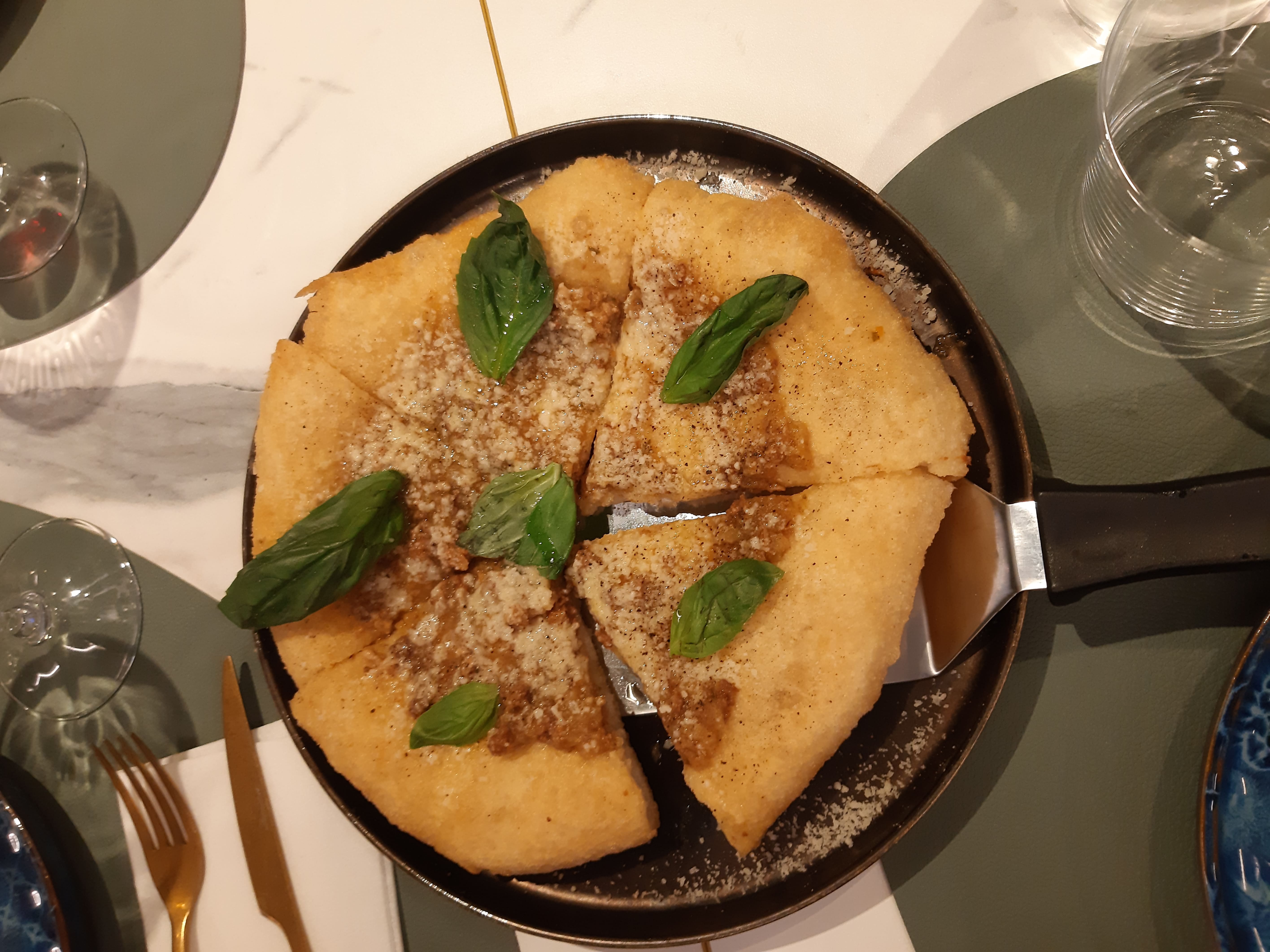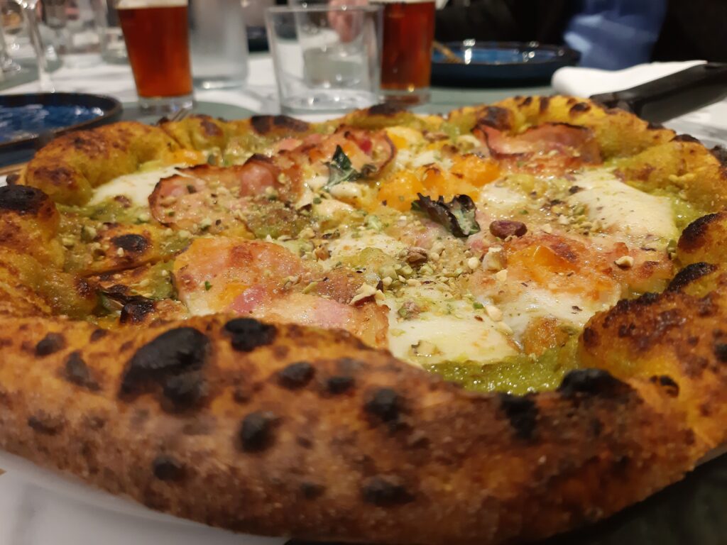 Prima però la sublime montanara fritta e asciutta come da manuale, completata da ragù alla genovese e per finire la “gialla in crosta” una special con impasto alla curcuma, crema di pistacchio di Bronte, provola affumicata, pomodorino giallo, pancetta croccante e granella di pistacchio.