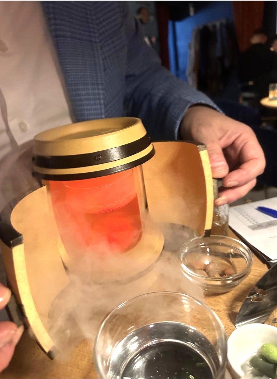 Anche l’ambiente contribuisce al viaggio. Luci soffuse in un rimando fra blu ottanio e arancione, linee di design e un equilibrio tra eleganza e informalità creano un’atmosfera accogliente e raffinata, dove ogni dettaglio invita a rallentare e lasciarsi sorprendere. Si vola fino agli Stati Uniti con Kentucky, omaggio alla patria del bourbon. Il drink arriva accompagnato da una botte da cui si sprigiona un velo di fumo che si dissolve nell’aria, evocando l’immaginario delle antiche distillerie americane.