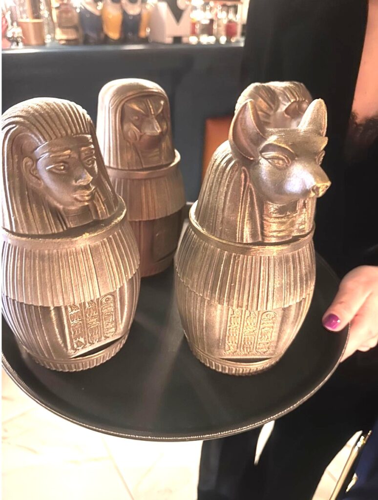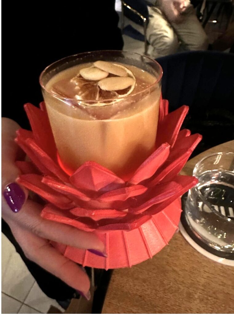 Ogni creazione arriva al tavolo come una piccola scena teatrale. I drink vengono serviti su particolari cover glass, composizioni artistiche esclusive pensate per richiamare l’anima del luogo a cui si ispirano. È un dettaglio scenografico che anticipa la degustazione e trasforma il cocktail in un oggetto narrativo.
