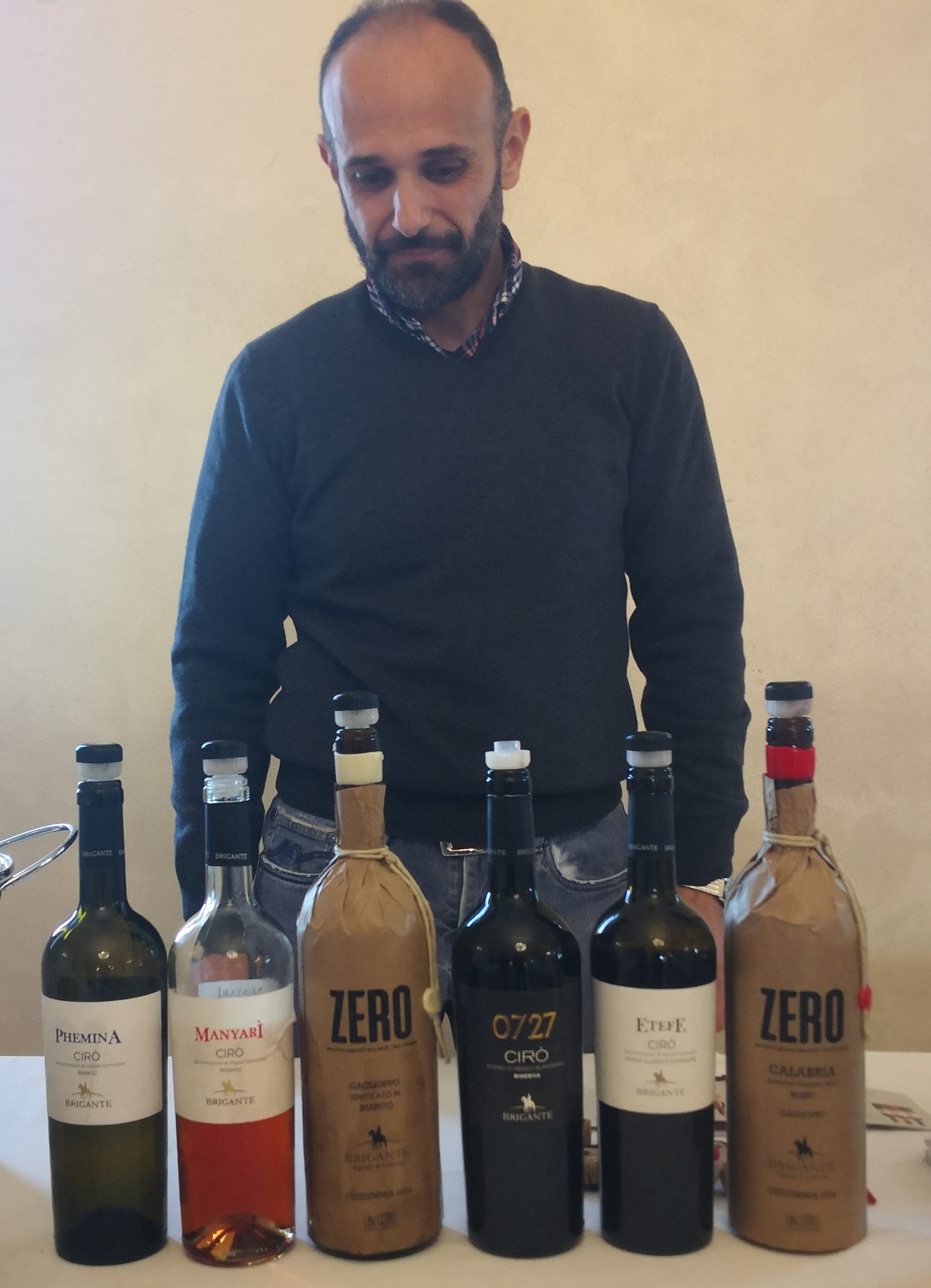 Enzo Sestito e Stefania Carè, sono gli eredi di una storia di viticoltura di famiglia che ha cent’anni d’esperienza. Dal 2007 la produzione del vino avviene con il nome di Brigante dal toponimo della località, dove in un’estensione di tredici ettari vitati le undici etichette aziendali danno luogo a circa 55.000 bottiglie l’anno. Greco Bianco, Pecorello e Gaglioppo sono i vitigni utilizzati. La linea denominata Zero, è composta da tre vini tutti a base di Gaglioppo, bianco, rosato e rosso, e si distingue nella presentazione della bottiglia, da un litro e avvolta in carta paglia dove sono stampate le nozioni del vino. La fermentazione avviene spontaneamente, non si aggiungono solfiti, e non si eseguono filtrazioni. Alla manifestazione abbiamo conosciuto il direttore delle vendite della Brigante Vini, Luigi Ceraudo.