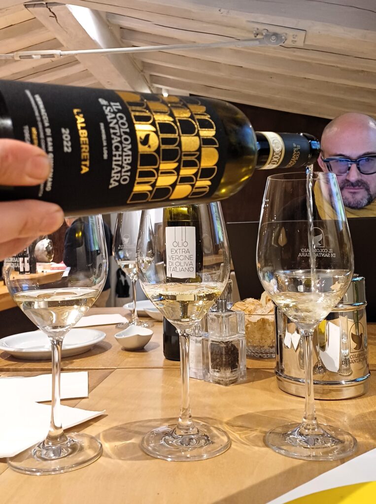 L’Albereta, Vernaccia di San Gimignano Docg, Riserva 2022, da un singolo vigneto, 250 metri ed esposizione a est. Si utilizza botte grande dal 2013, soppiantando l’uso della barrique. Fermenta e affina in legno, poi passa in cemento e infine bottiglia. Le sensazioni qui sono citriche, agrumate. Un ottimo vino pulito ed elegante, figlio di una lavorazione attenta, senza diraspatura delle uve per non stressare gli acini che nella varietà hanno una buccia molto sottile.